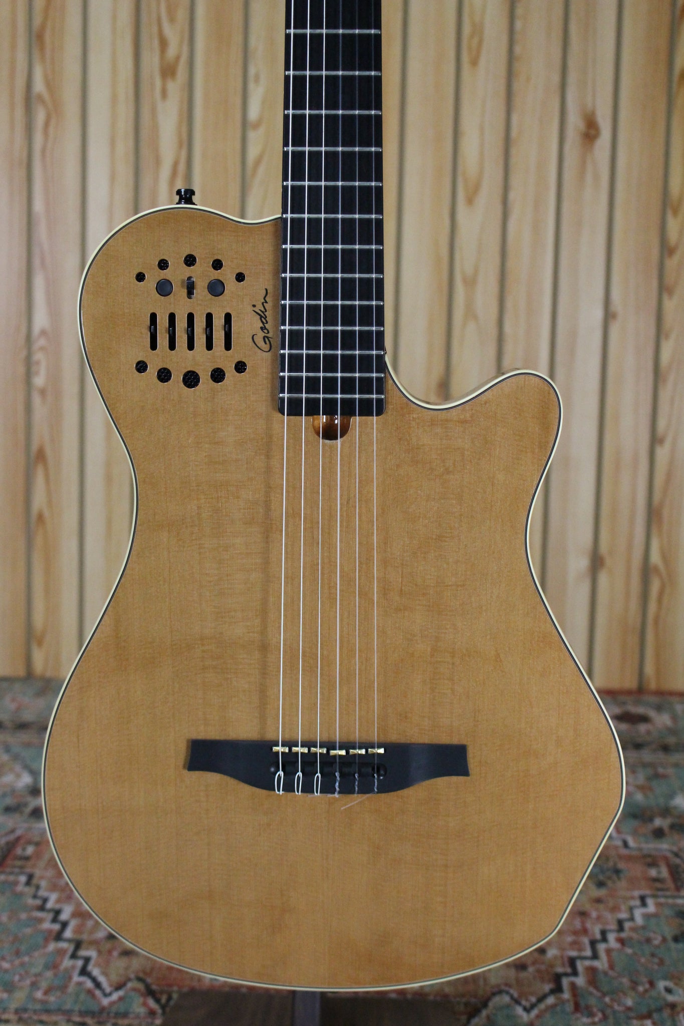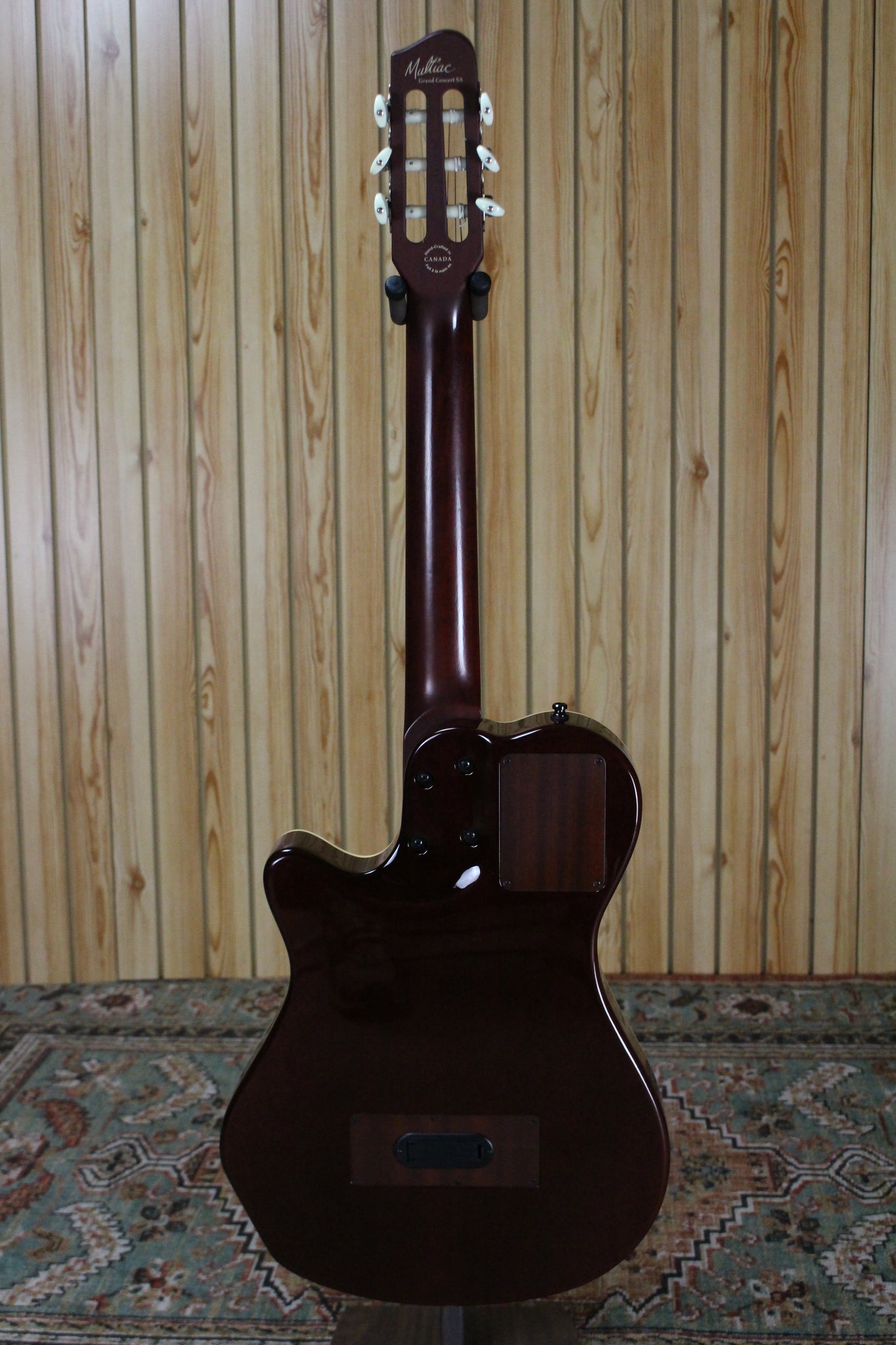 This 2018 Godin Multiac Grand Concert SA acoustic-electric guitar is an instrument that defies simple definition, with its chambered mahogany body and solid cedar top, it offers the playability of a solid body electric, the organic warmth of a traditional nylon. The flexibility of the onboard RMC Polydrive electronics, coupled with the Synth Access hexaphonic pickup output, let’s you take full advantage of today's hottest guitar processors.