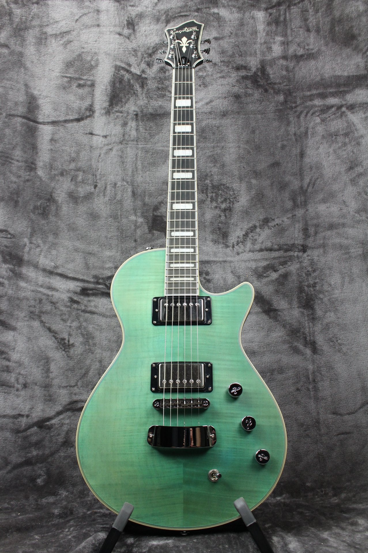 Summary: This Hagstrom Ultra Max looks great with its flame maple top finished in “Fall Sky Satin”. The Custom 60 Alnico 5 humbuckers have a coil split option in the master volume knob that lets you choose between hot humbucker or “spanky” single coil tones. It has just been setup and restrung by our in-house guitar tech and ships in a gig bag.