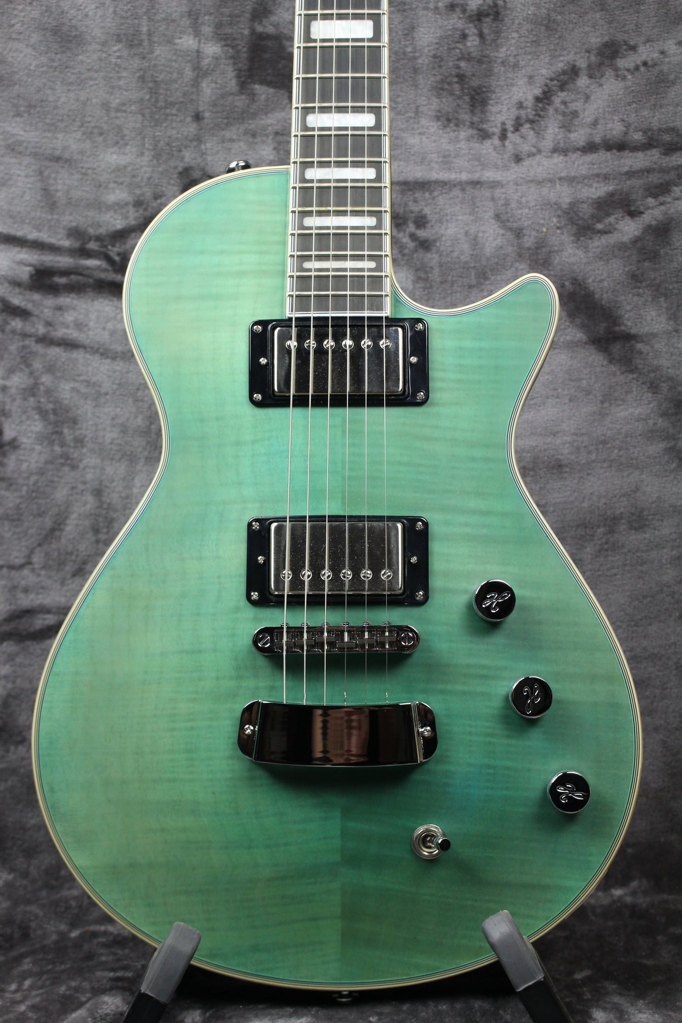 Body: Mahogany body with flame maple top, Fall Sky Satin finish and multi-ply pearloid binding.