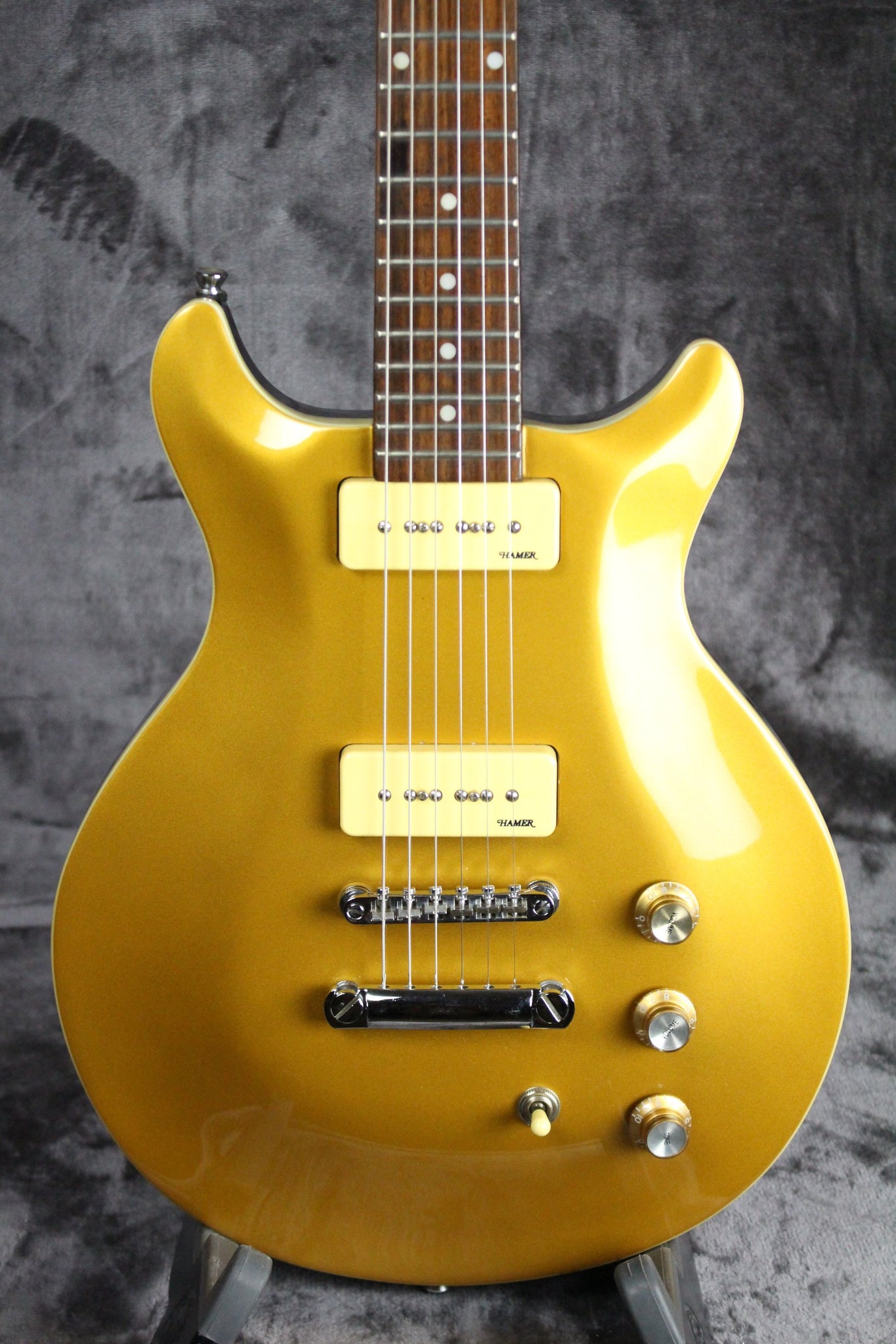 Pickups/Hardware: Two Hamer P90 pickups, Hamer closed gear tuning keys, volume/tone controls/3-way pickups selector, tunomatic bridge/stop bar tailpiece.