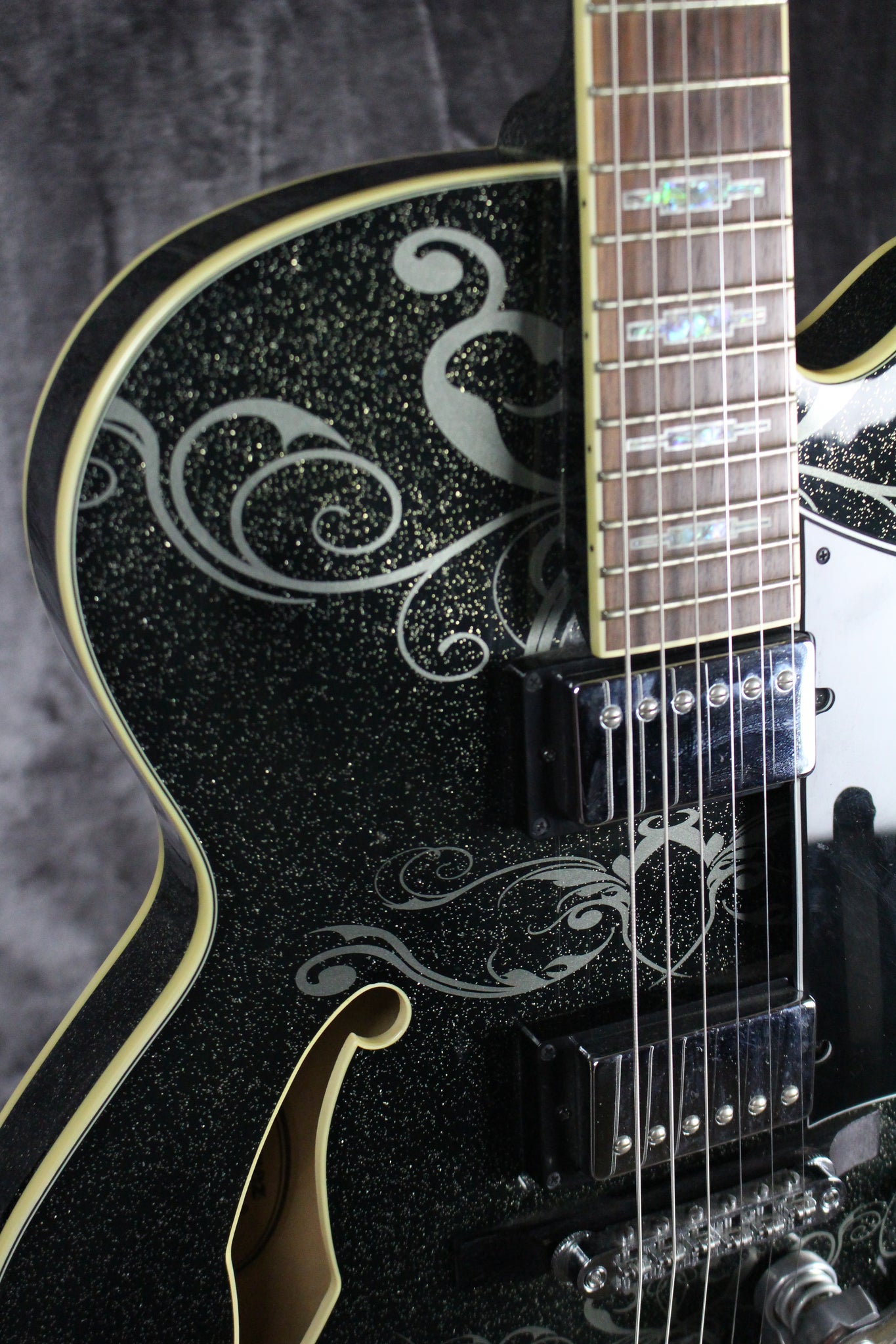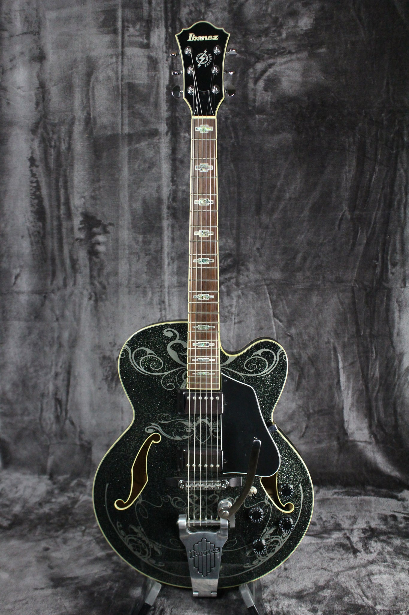 Pickups/Hardware: Ibanez Artcore Humbucker pickups, Ibanez die-cast with half-moon buttons tuning keys, VBF70 vibrato bridge, ART-2 roller on a blackwood base, speed knobs, Ivory plastic nut.