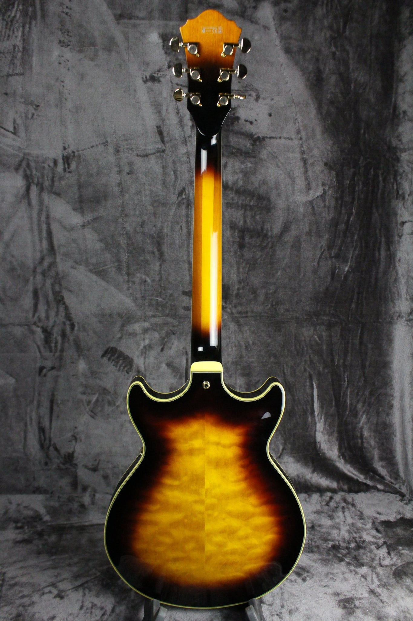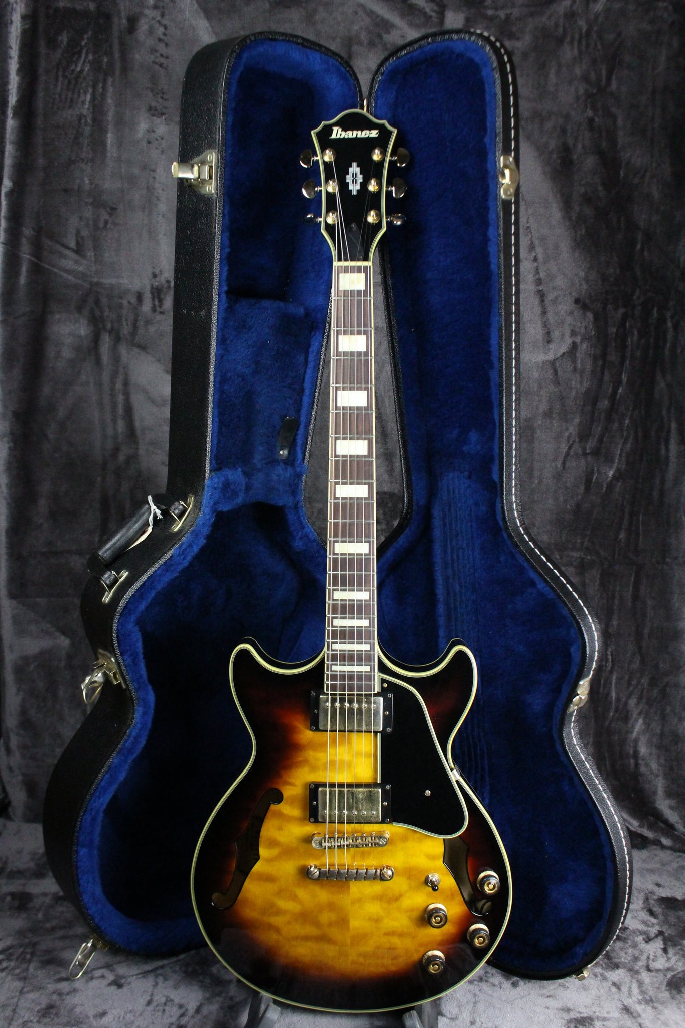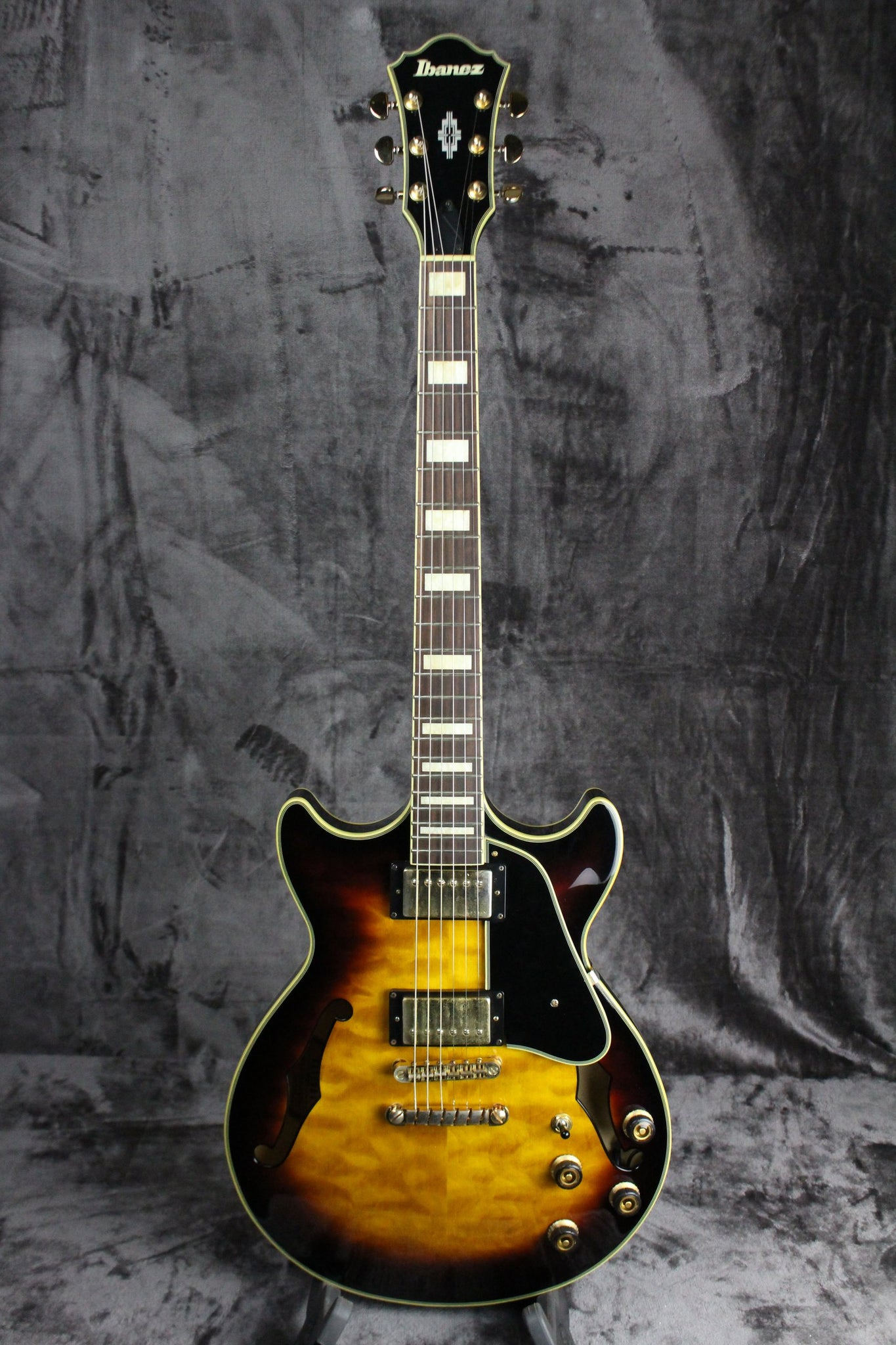 Summary: The Ibanez AM93 electric guitar gives you the best of both worlds, the warmth and resonance of a semi-hollow body and the compact handling ease of a solid body. The AM93's distinctive double cutaway makes for easy access to the 22 frets set into this guitar's bound ebony fingerboard that has pearl block inlays. The AM93 sports a quilt maple top and quilt ash back and sides and is dressed in gold hardware.