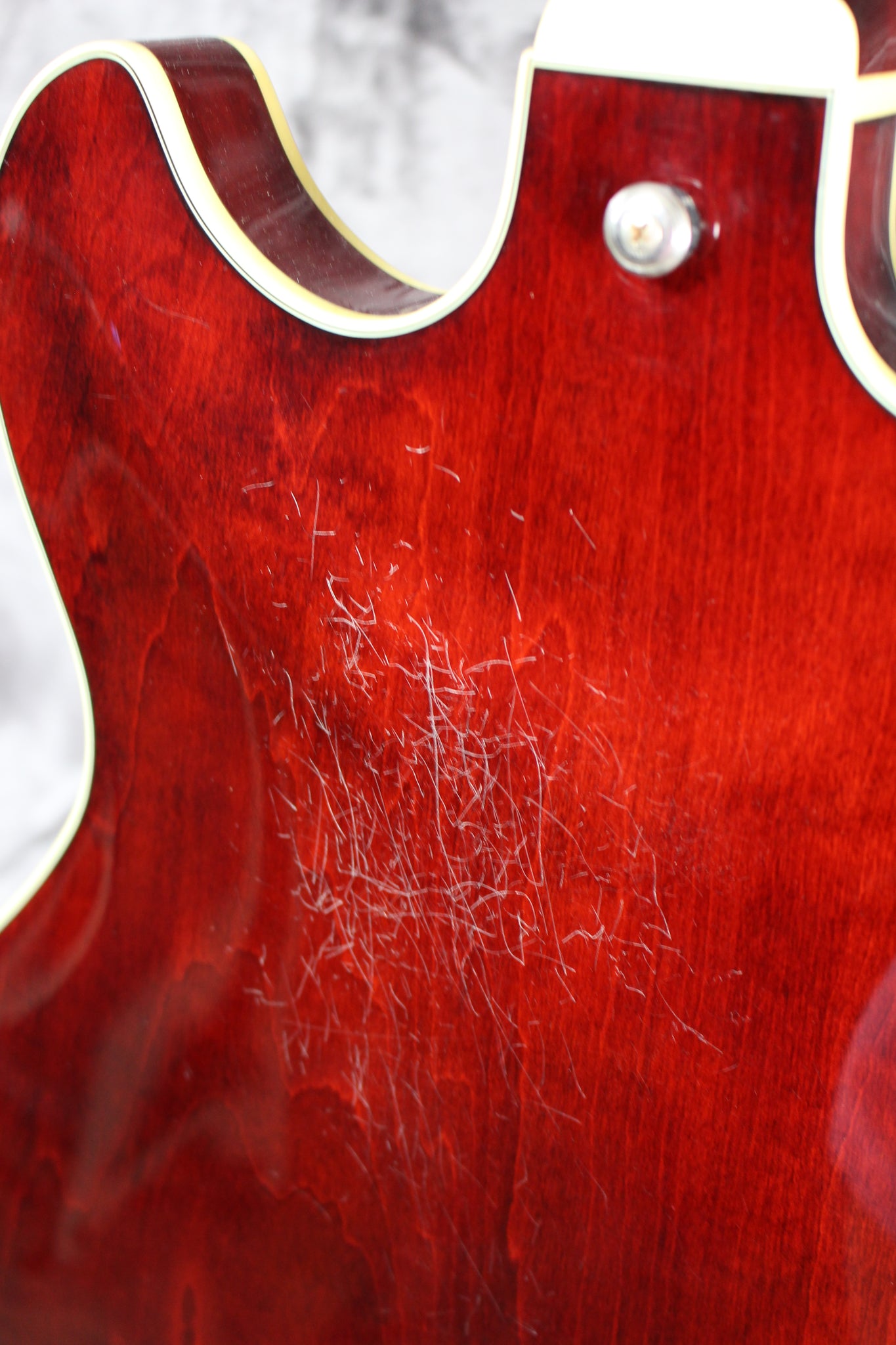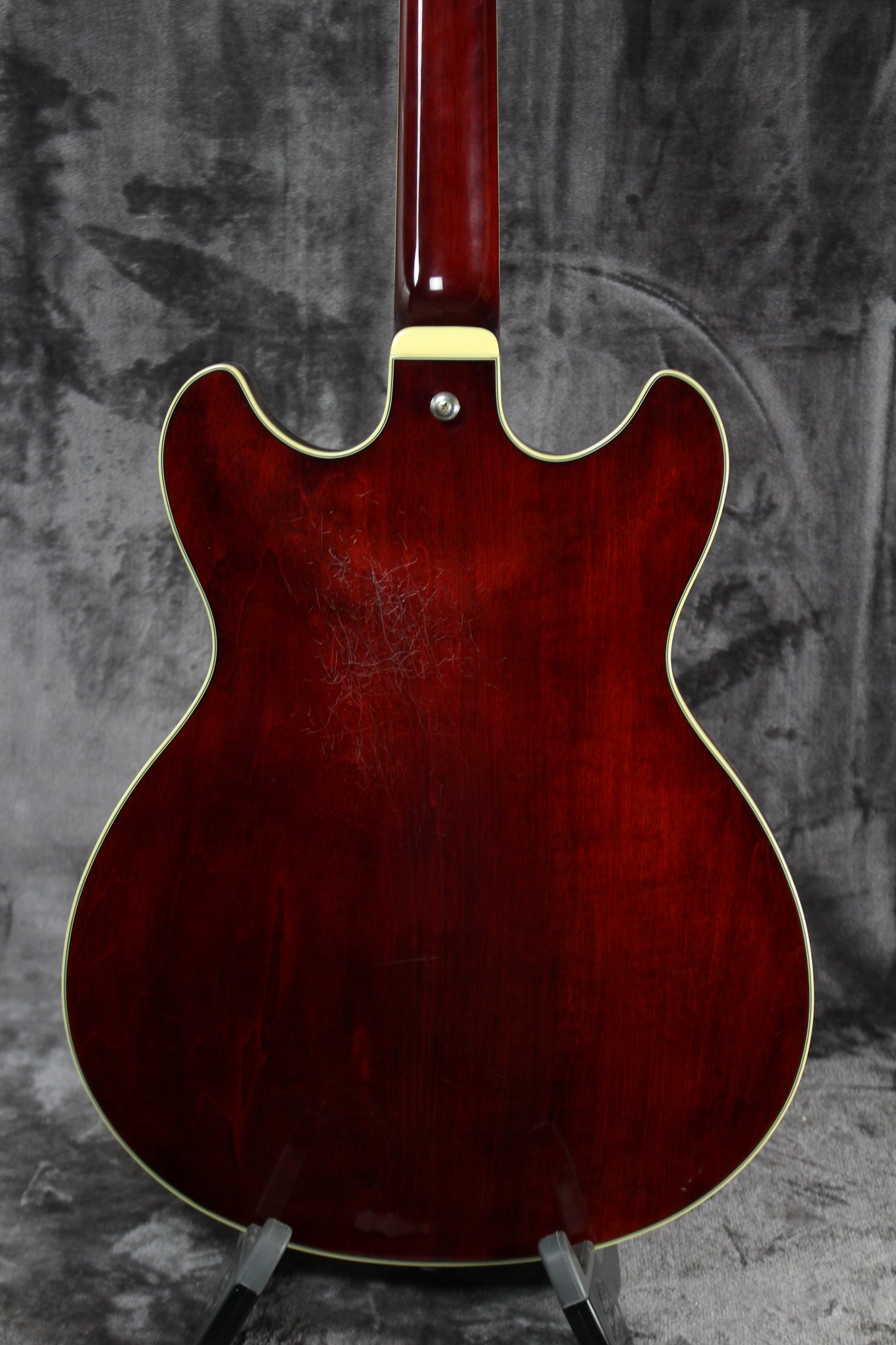 Body: Semi-hollow body all-laminate linden body with 2 fully bound f-holes….the Top and back have beautiful cream binding and a cool Transparent Crimson Red finish.