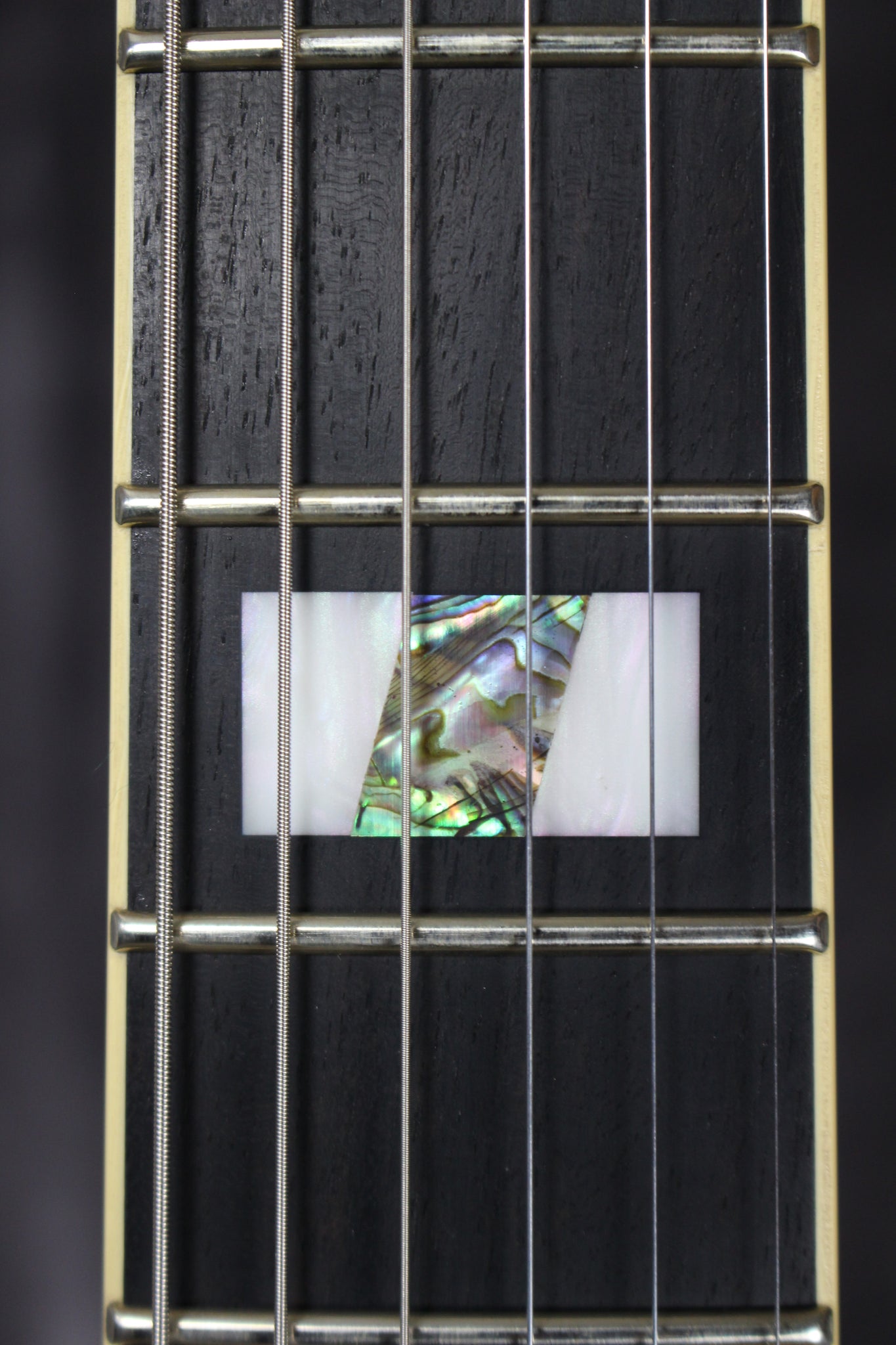 Neck: Mahogany with a bound Ebony fingerboard, 24.7” scale length, 1.71” nut width, 22 frets, Abalone block inlays.