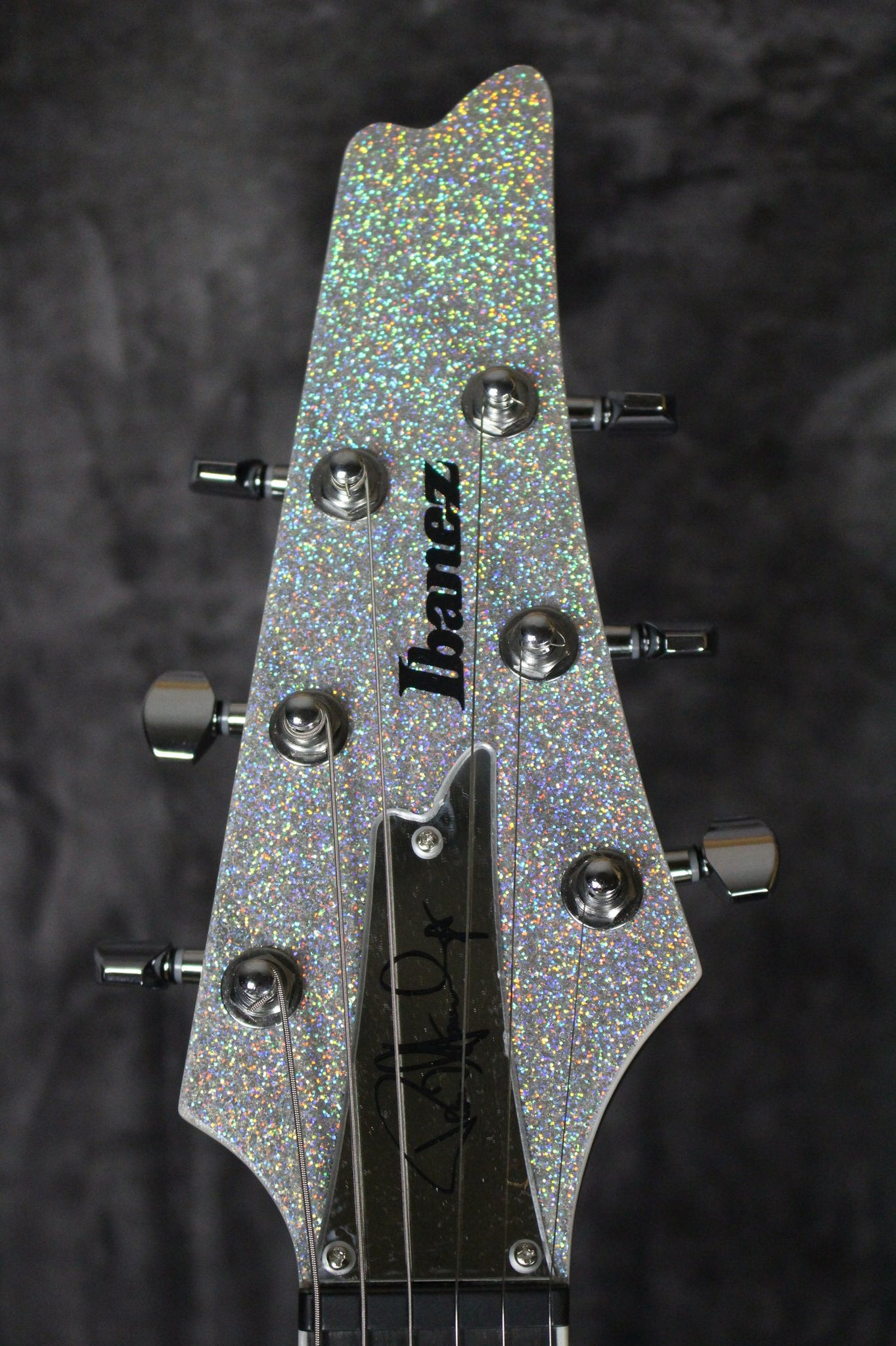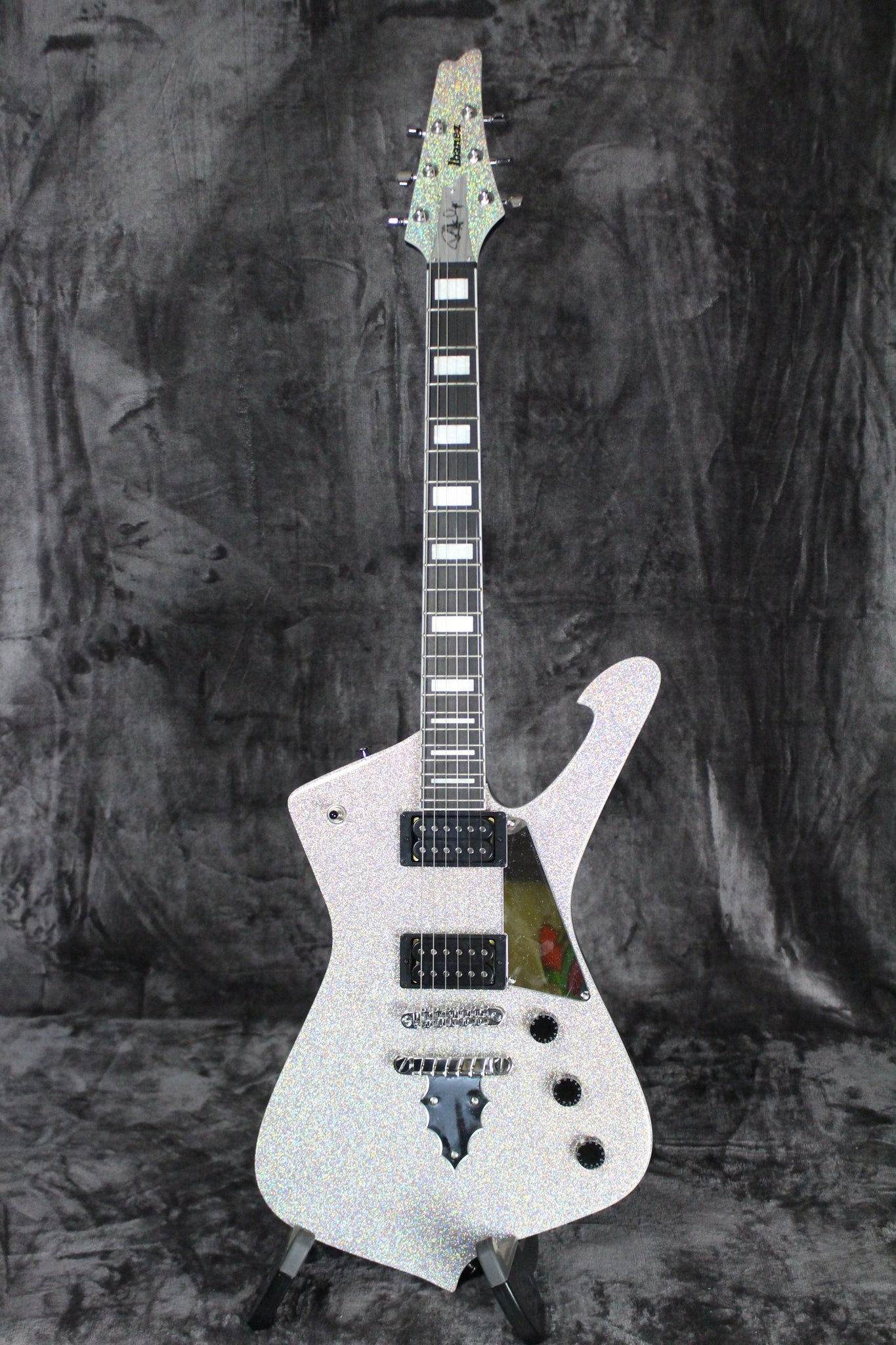 Summary: This Paul Stanley PS60 from Ibanez is in excellent condition and plays very. It has been set up by our in-house technician. It has light surface scratches on the back of the body and the sparkle finish changes colors depending on the direction of the guitar. It comes equipped with two hot humbuckers and a mirror pickguard.