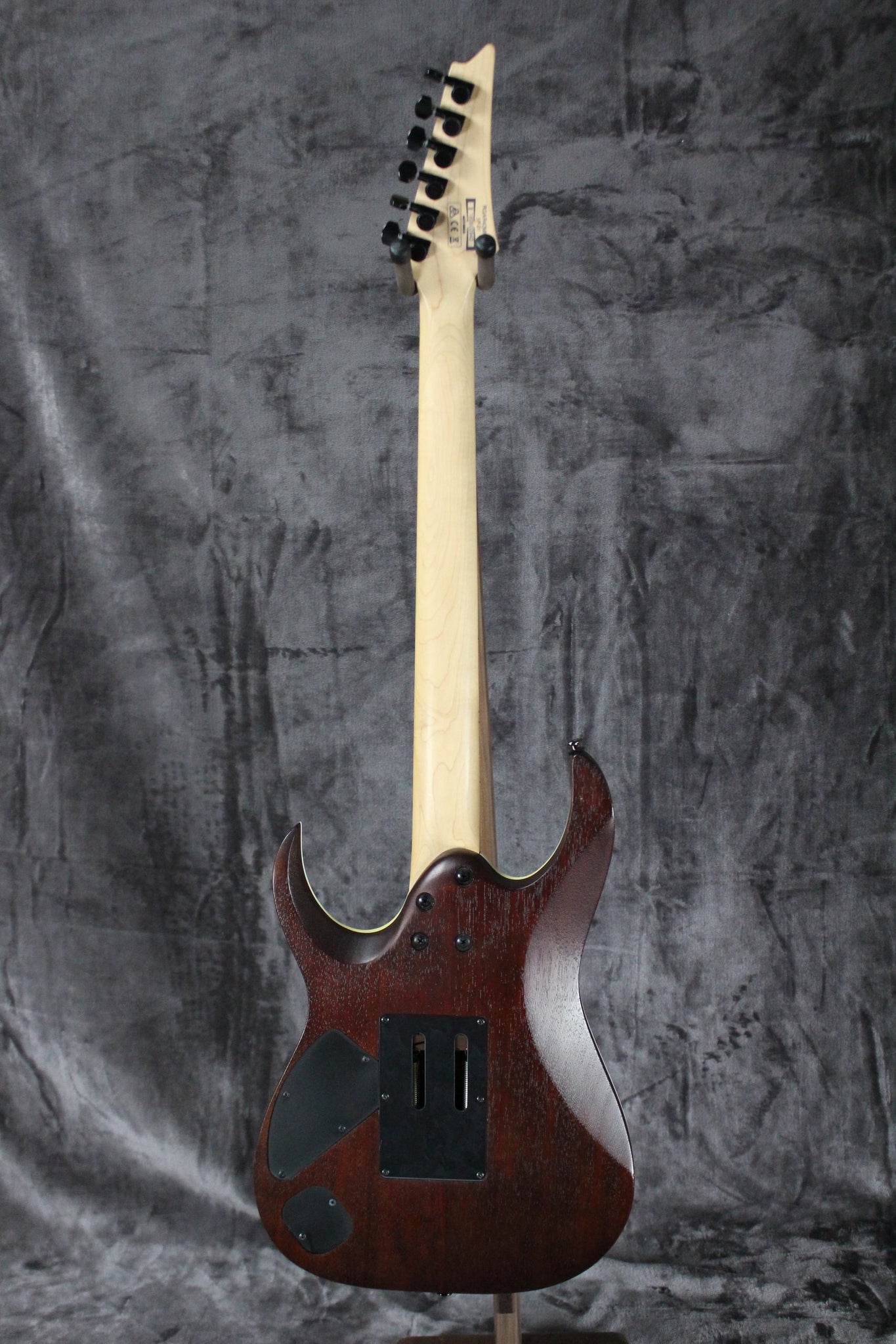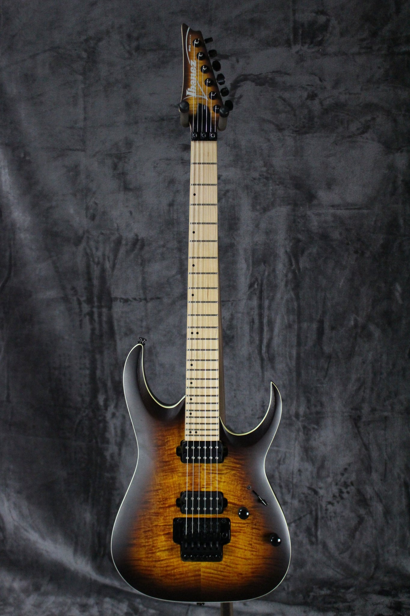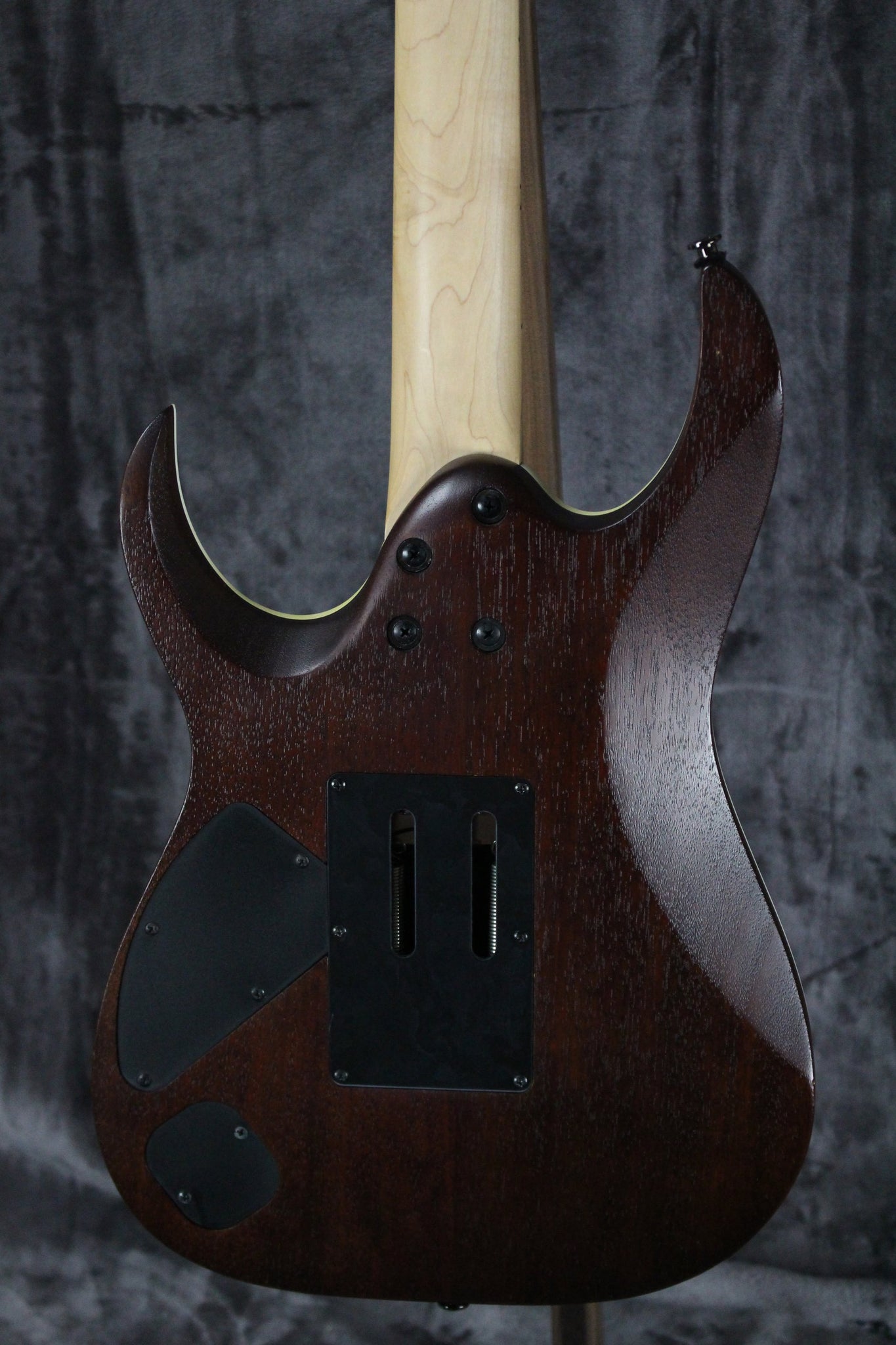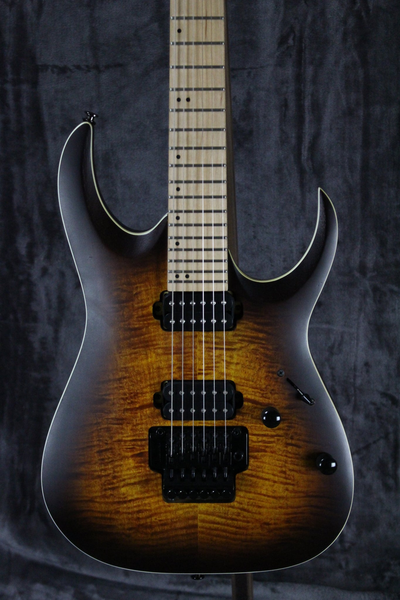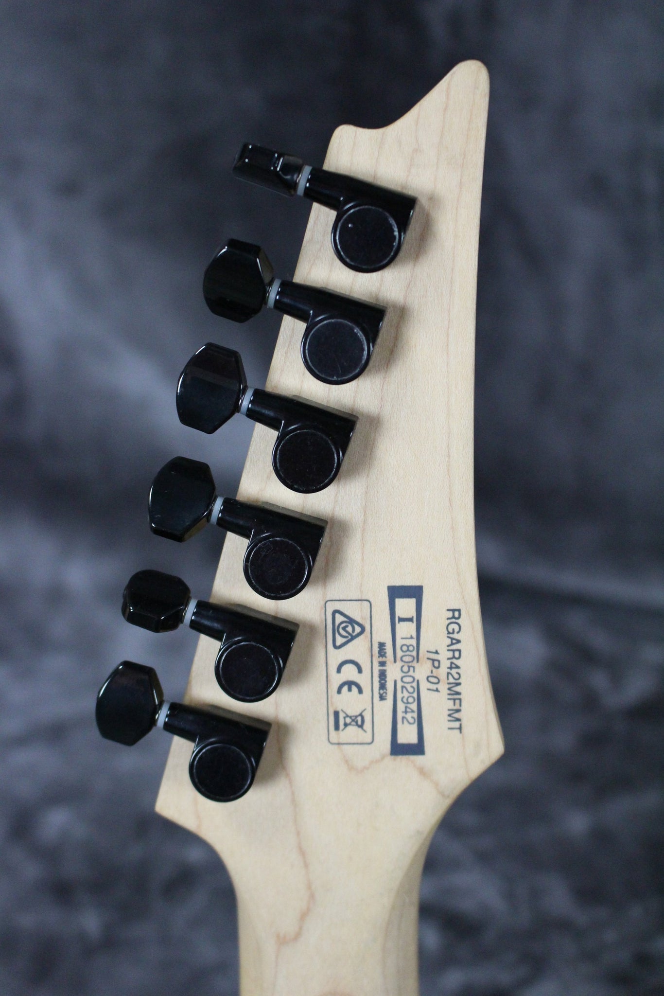 This Ibanez RGAR42MFMT features a Mahogany body with an arched flamed Maple top bolted to a Maple neck with a reversed headstock and a 24-fret Maple fingerboard with offset dot position markers. Choice components include dual, passive Ibanez Quantum humbucking pickups and a double locking tremolo bridge.