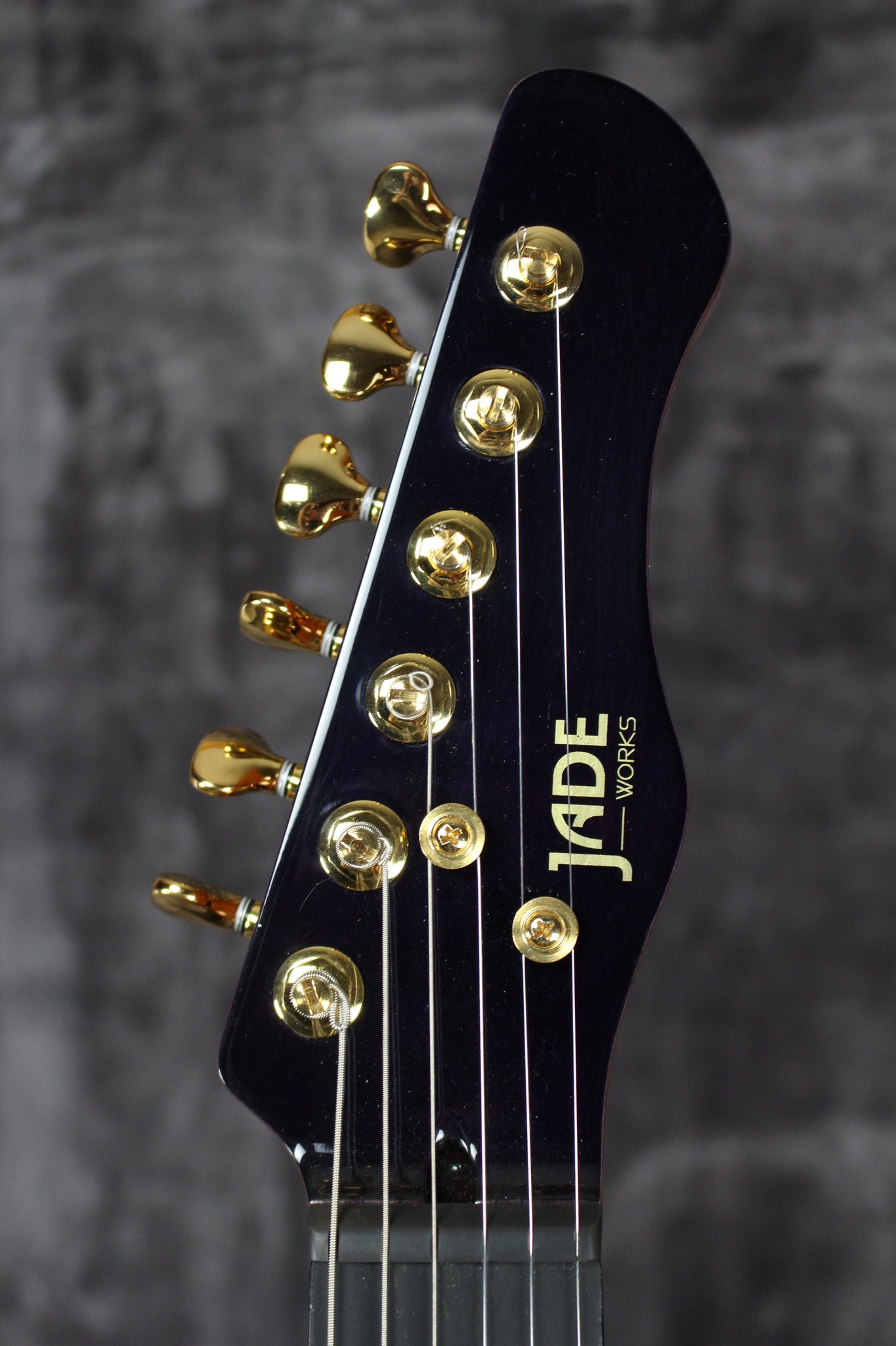Summary: This Jadeworks Butterfly is a custom made instrument by Rhode Island based Jadeworks, features a stunning dark purple Swamp Maple top over a one piece Mahogany body that is chambered for weight relief. The neck is three pieces, with 22 frets on an Ebony fretboard, and a Birch headstock veneer. The Butterfly was crafted in memory of victims of Sandy Hook, and a portion of the proceeds will be donated accordingly. The 25.5″ neck to be more of a D-shape, inspired by vintage Les Pauls, while also featuring a volute. The Butterfly singlecut, has two TV Jones Filter’Trons; a classic model in the neck, and a classic plus in the bridge position. A 3-way switch accompanies the volume and tone knobs, which are made of hand turned ebony to match the well appointed aesthetic.
