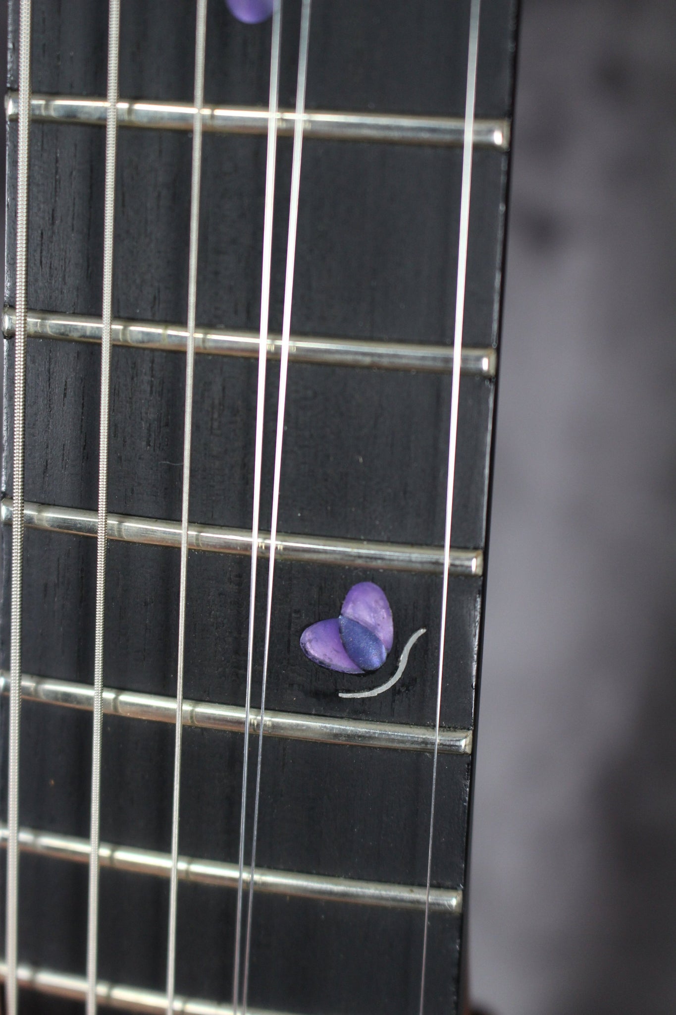 Neck: Mahogany with a Ebony fingerboard, 25.5” scale length, 1.687” nut width, 22 frets, purple pearl inlays, featuring a ’Dylan’s Wings of Change’ butterfly inlay at the 12th fret.