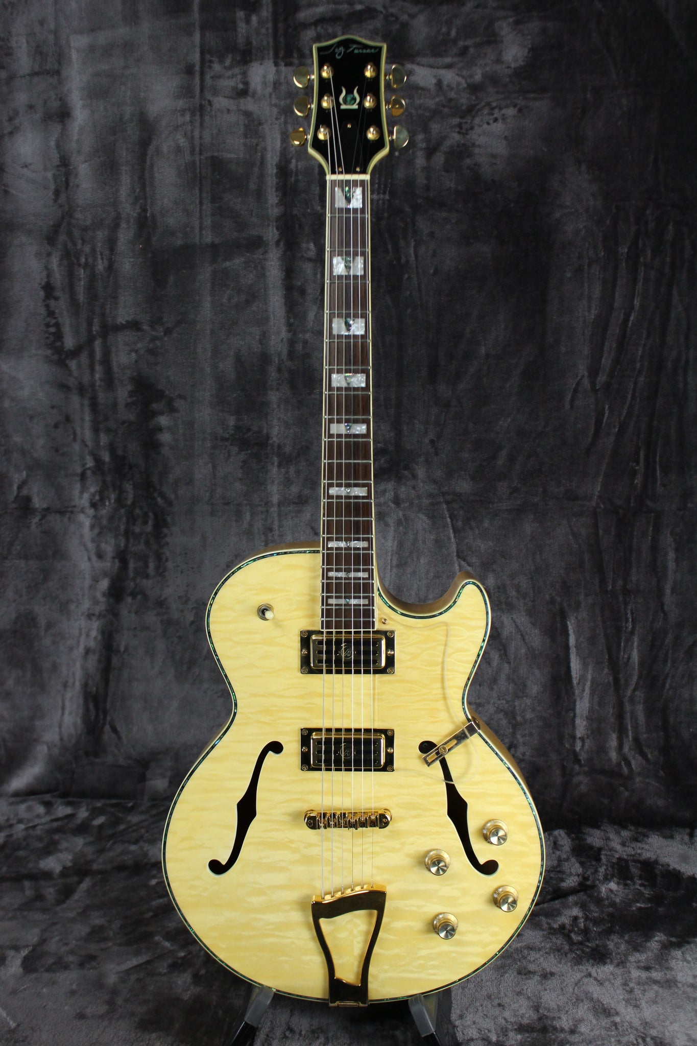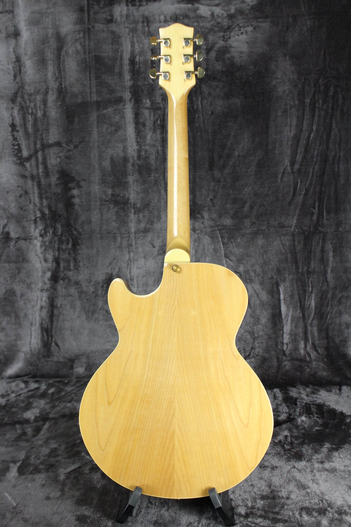 Summary: This Jay Turser JT-155 is a hollow body jazz guitar, appointed with a Maple arched top, maple set neck, rosewood fingerboard with abalone block and triangle inlay, bound F-holes and abalone binding on body. Alnico humbuckers, 3-way selector switch, 2 volume and 2 tone controls, clear pickguard along with gold hardware make this instrument a joy.