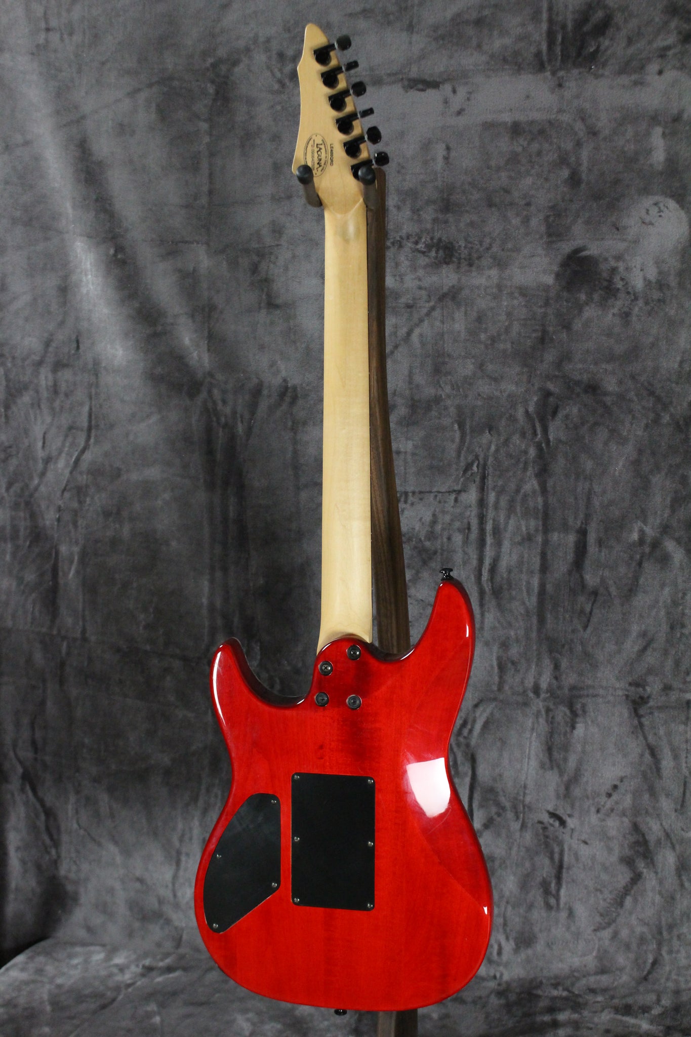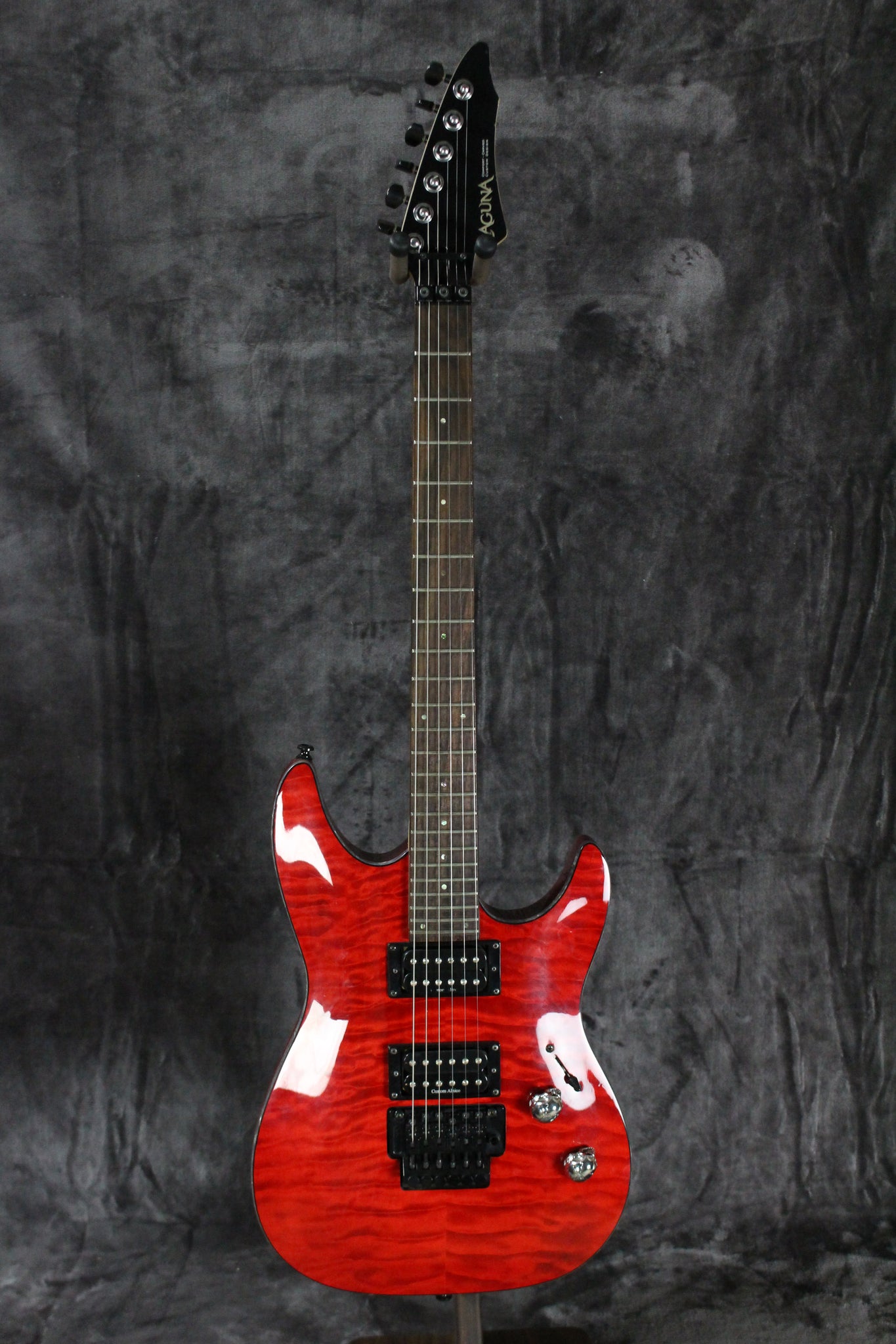 This Laguna electric guitar is in great shape and is set up very well. The FR style tremolo system allows for all the dive bombing and bending you can handle. The knobs have been replaced with chrome skull knobs and the top of the body has a beautiful red quilt. It has two custom alnico humbuckers with a ton of output.