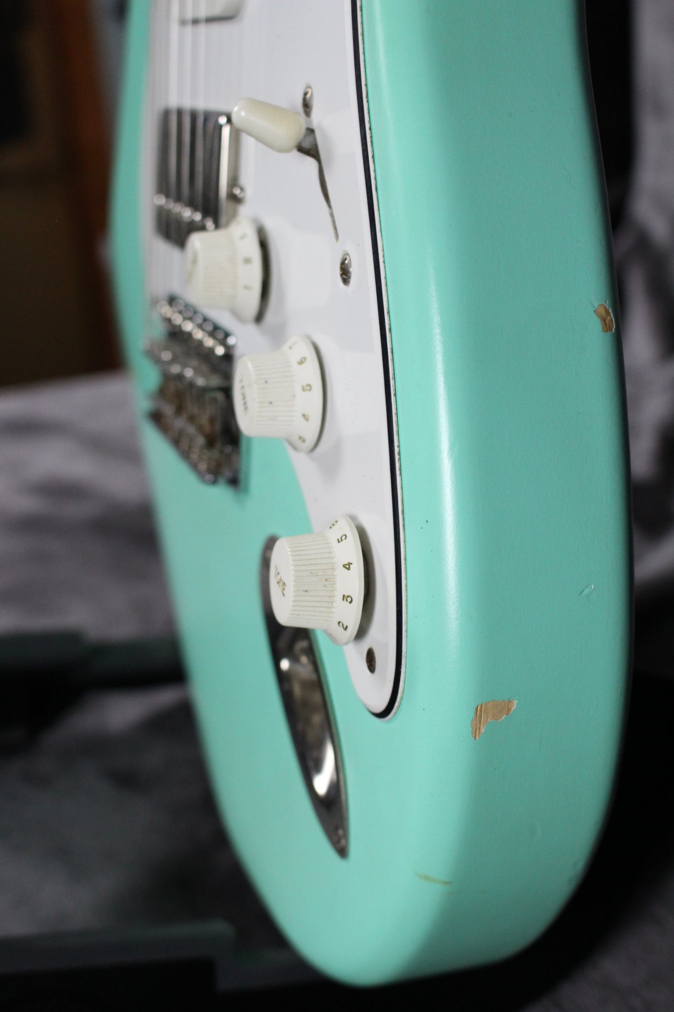 Cosmetics: This guitar is in great shape. It has light surface scratches and small indentations on the body, as it was medium/light relic’d. The back of the neck has a bit of relic’ing, as does the headstock (pictured), and the frets show minimal wear. Overall, this guitar plays very well and sounds fantastic.