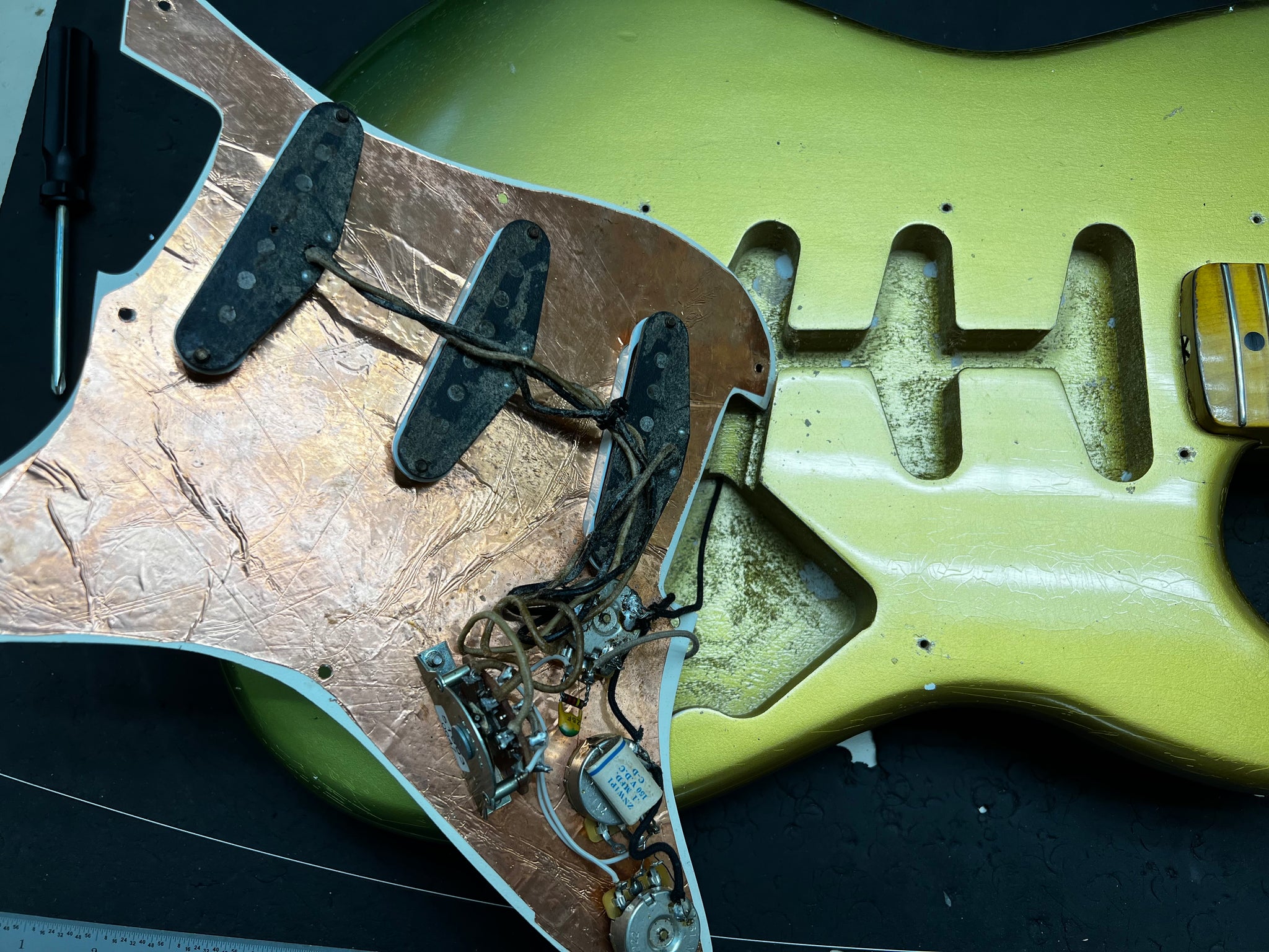 Cosmetics: This guitar is in excellent shape. It has light surface scratches and small indentations on the body, along with the patina and crazing of a wonderfully relic’d instrument. The back of the neck is clean, and the frets show minimal wear. Overall, this guitar plays very well and sounds fantastic.