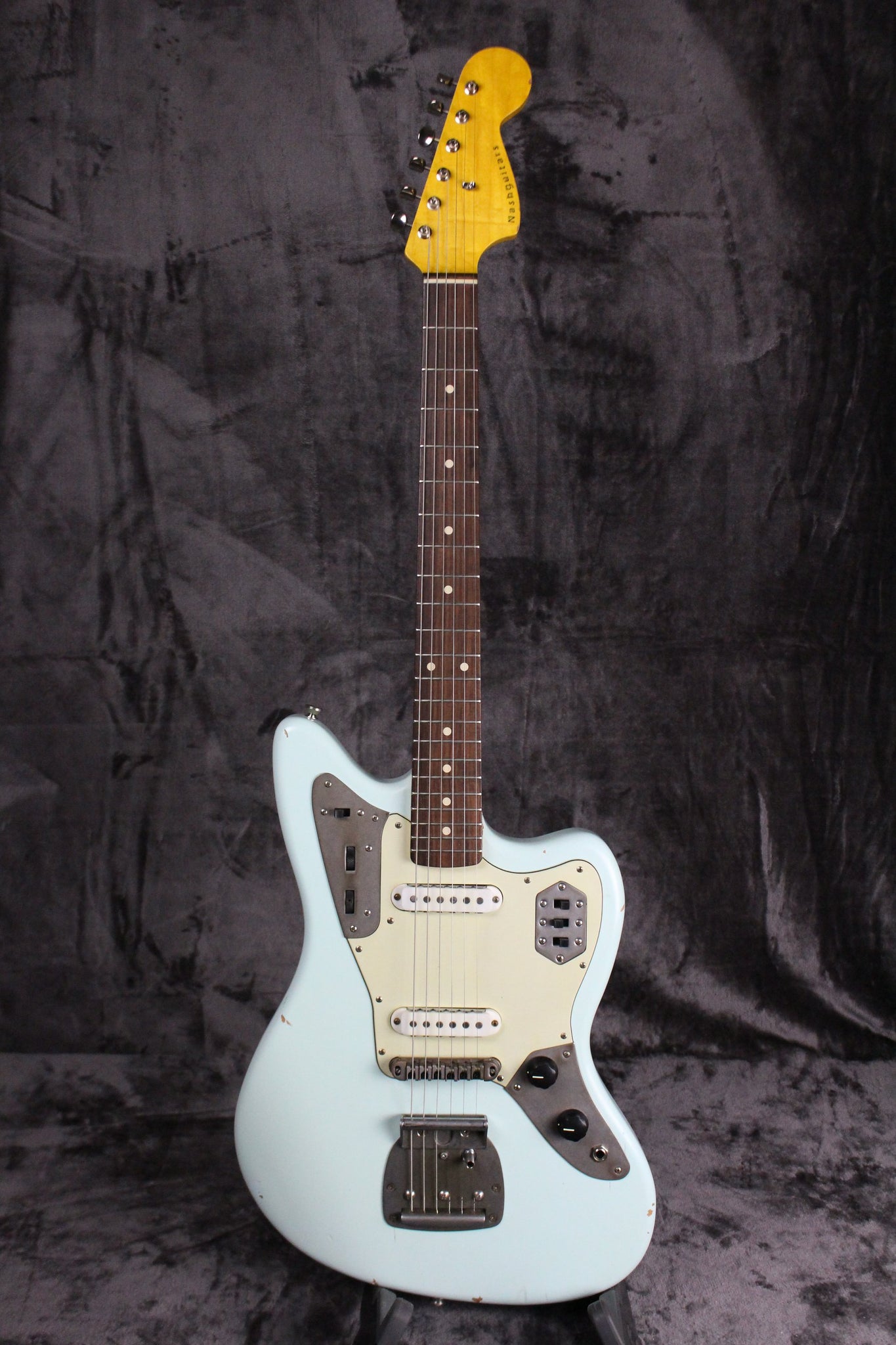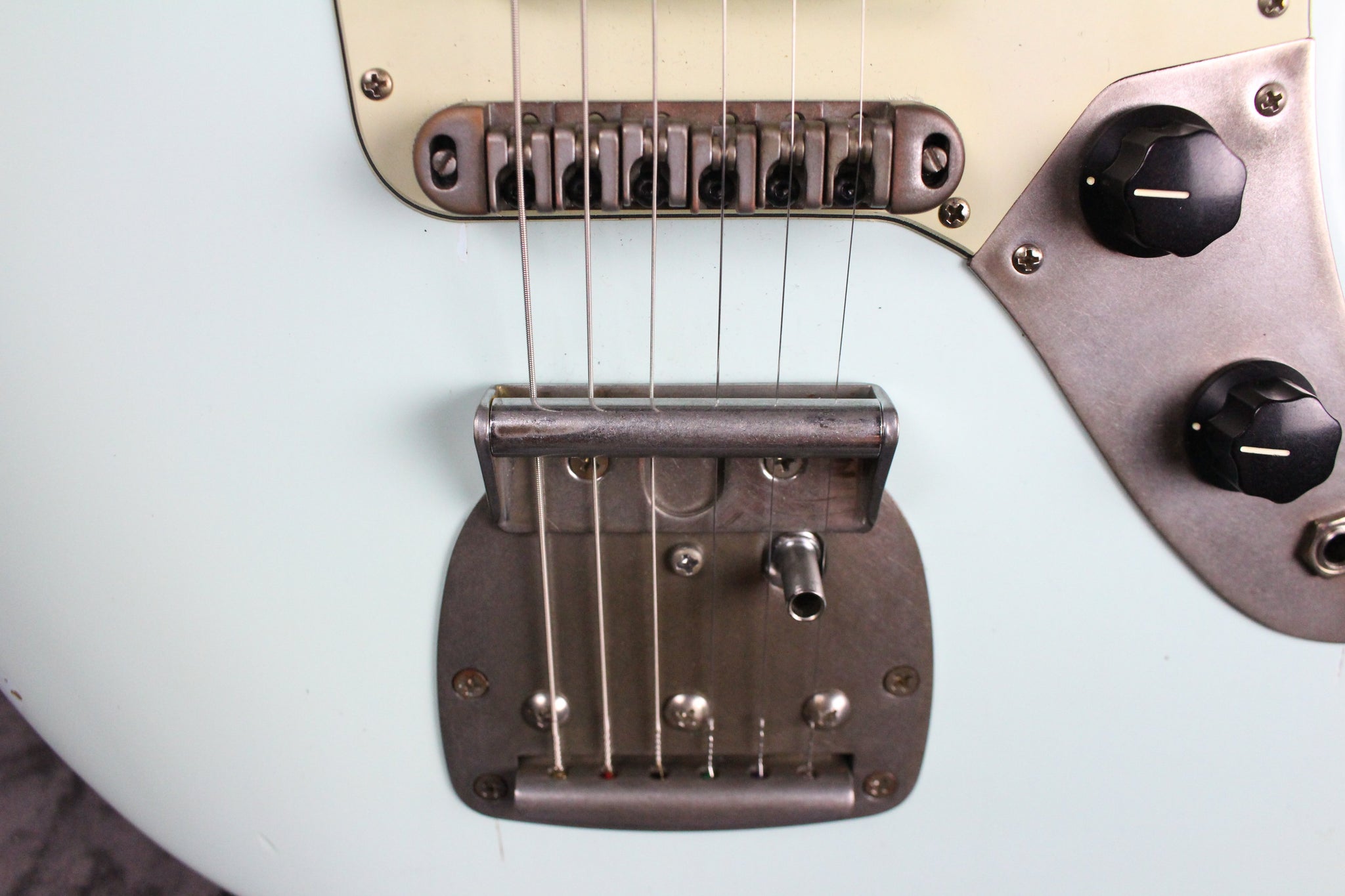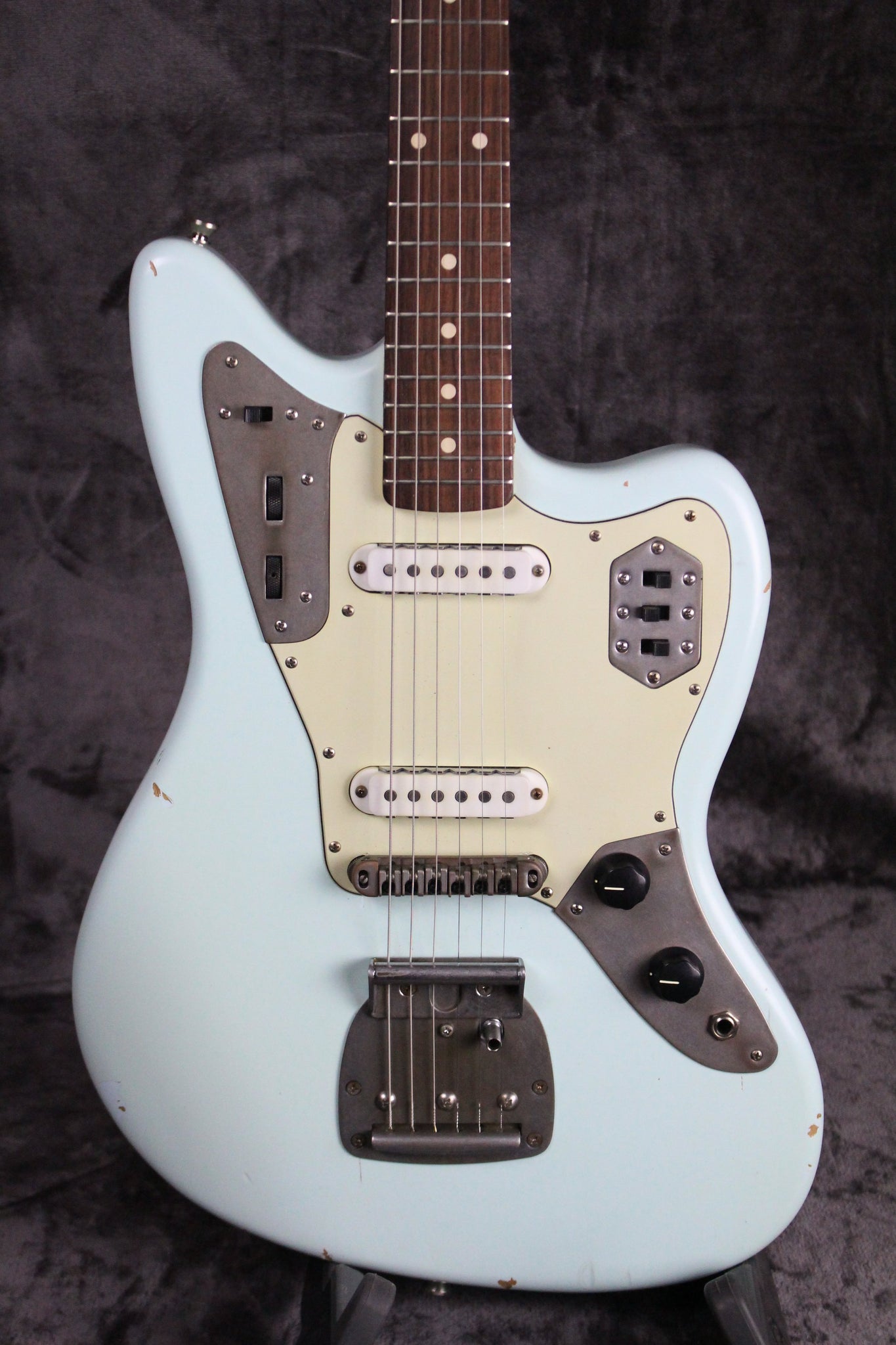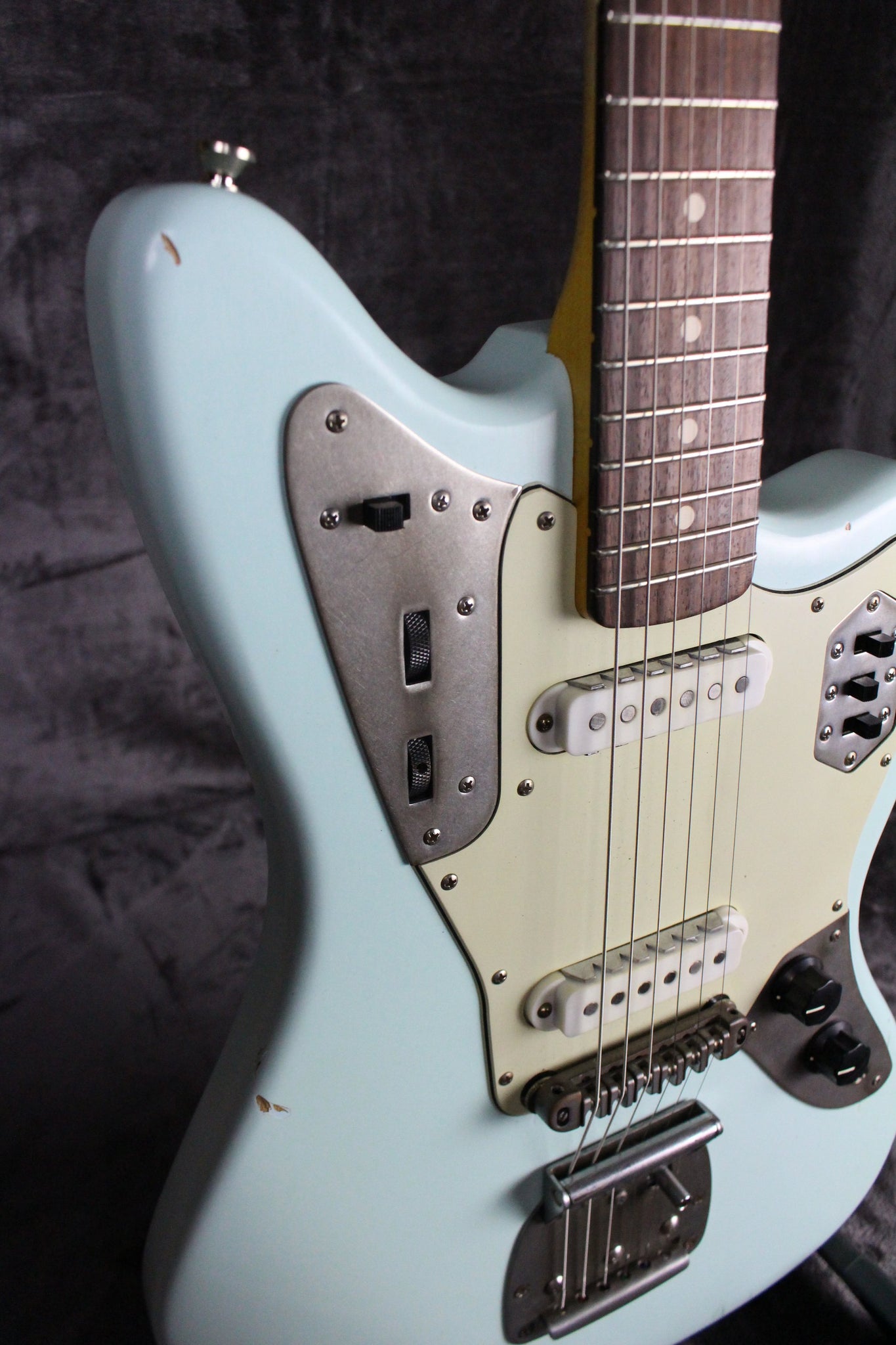 Pickups/Hardware: Two Lollar Jaguar pickups, Jaguar controls, roller style bridge, vintage style tuning keys, buzz stop tailpiece, Jag/Jazz style tremolo system, 3-ply mint green pickguard.