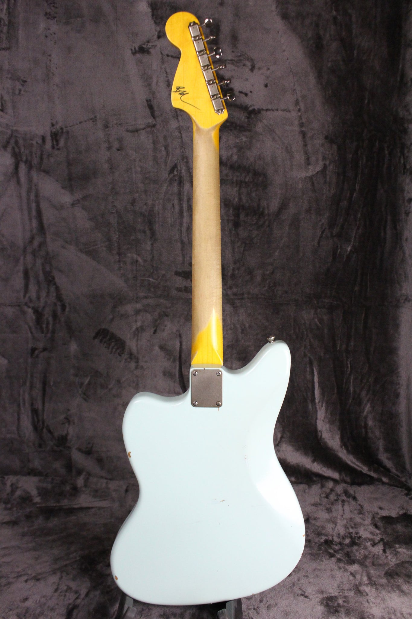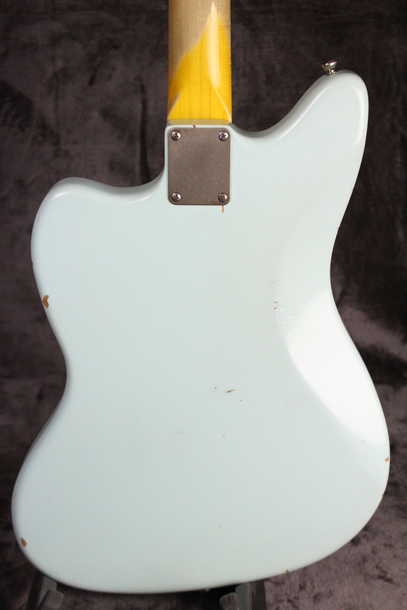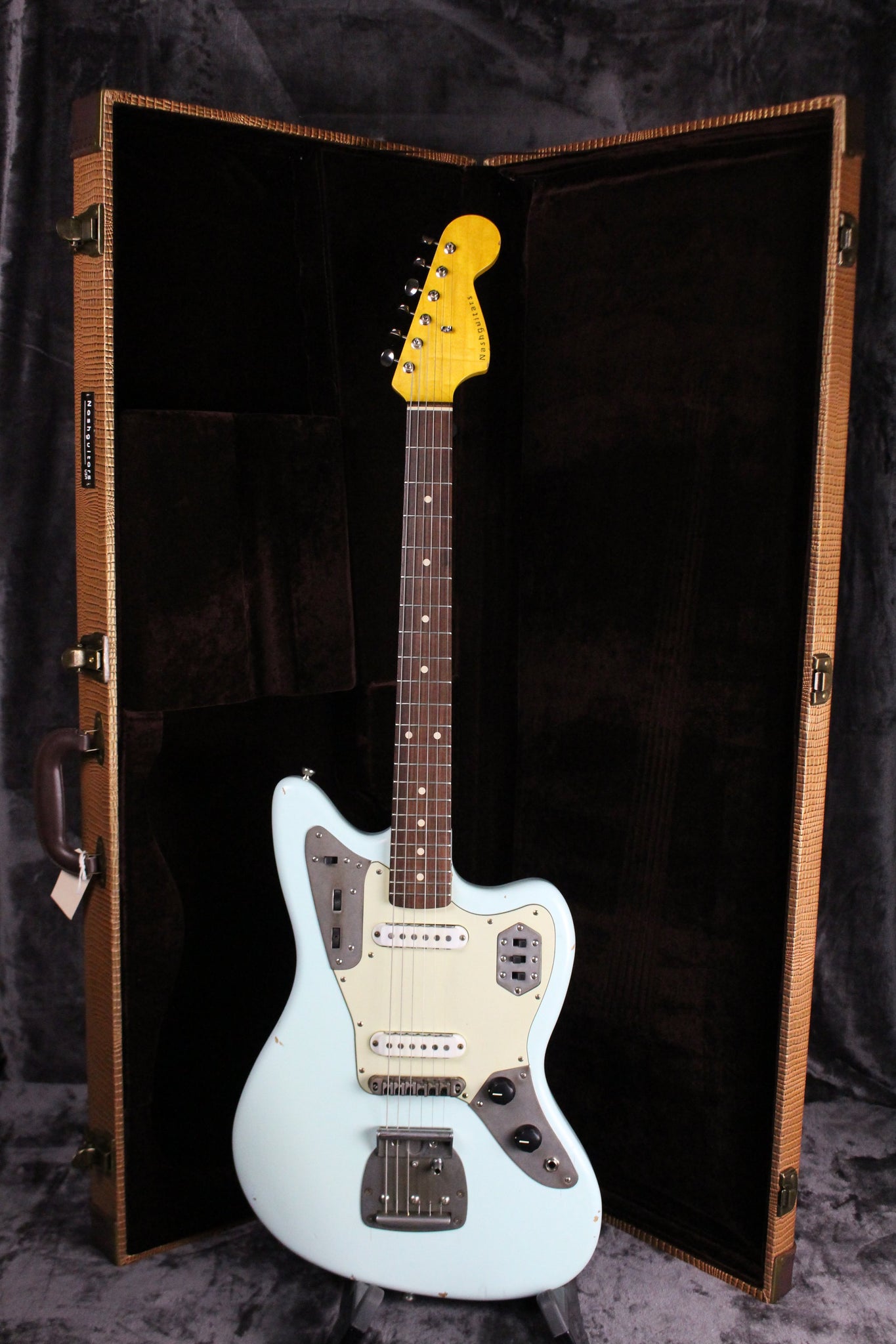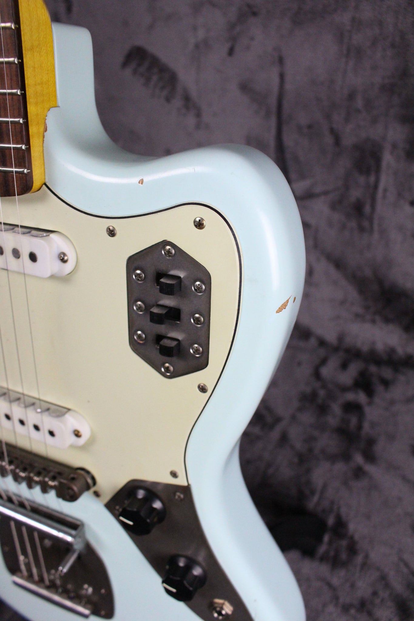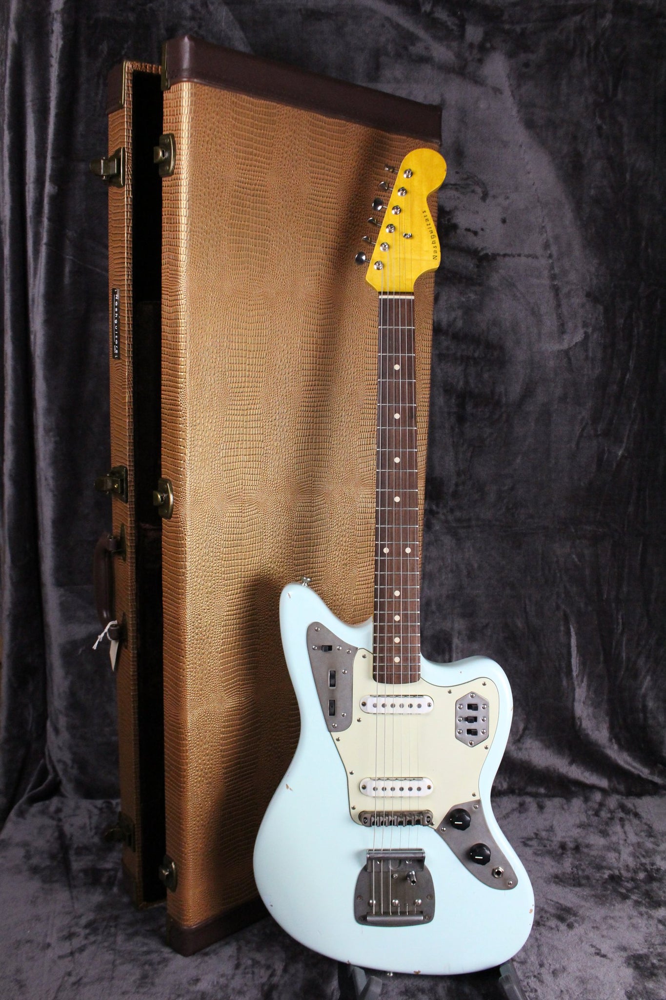 Pickups/Hardware: Two Lollar Jaguar pickups, Jaguar controls, roller style bridge, vintage style tuning keys, buzz stop tailpiece, Jag/Jazz style tremolo system, 3-ply mint green pickguard.