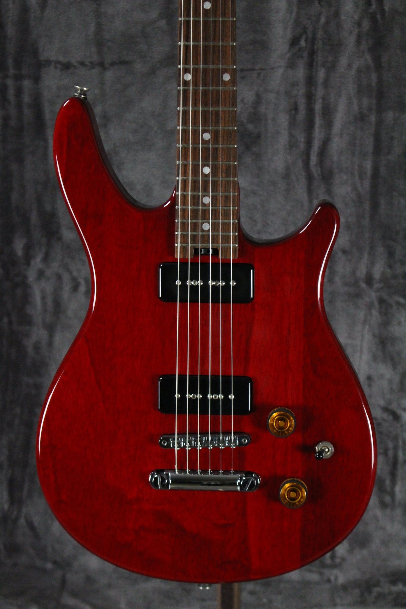 Pickups/Hardware: Peavey P90 pickups, chrome tuning keys, adjustable bridge and stopbar tailpiece, amber speed knobs, acrylic nut.