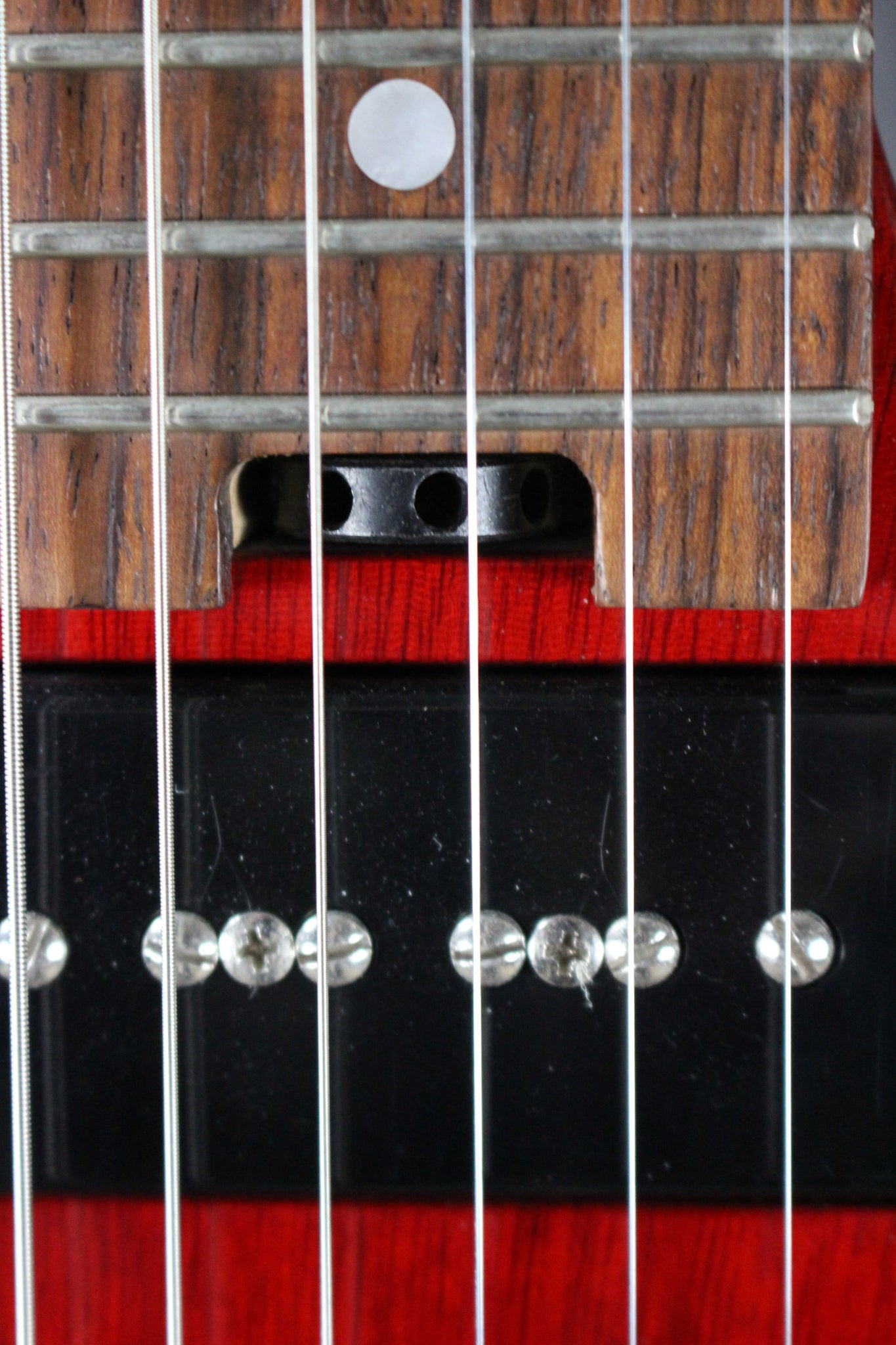 Neck: Maple with a Rosewood fingerboard, 25” scale length, 1.68” nut width, 22 frets, pearl dot inlays.