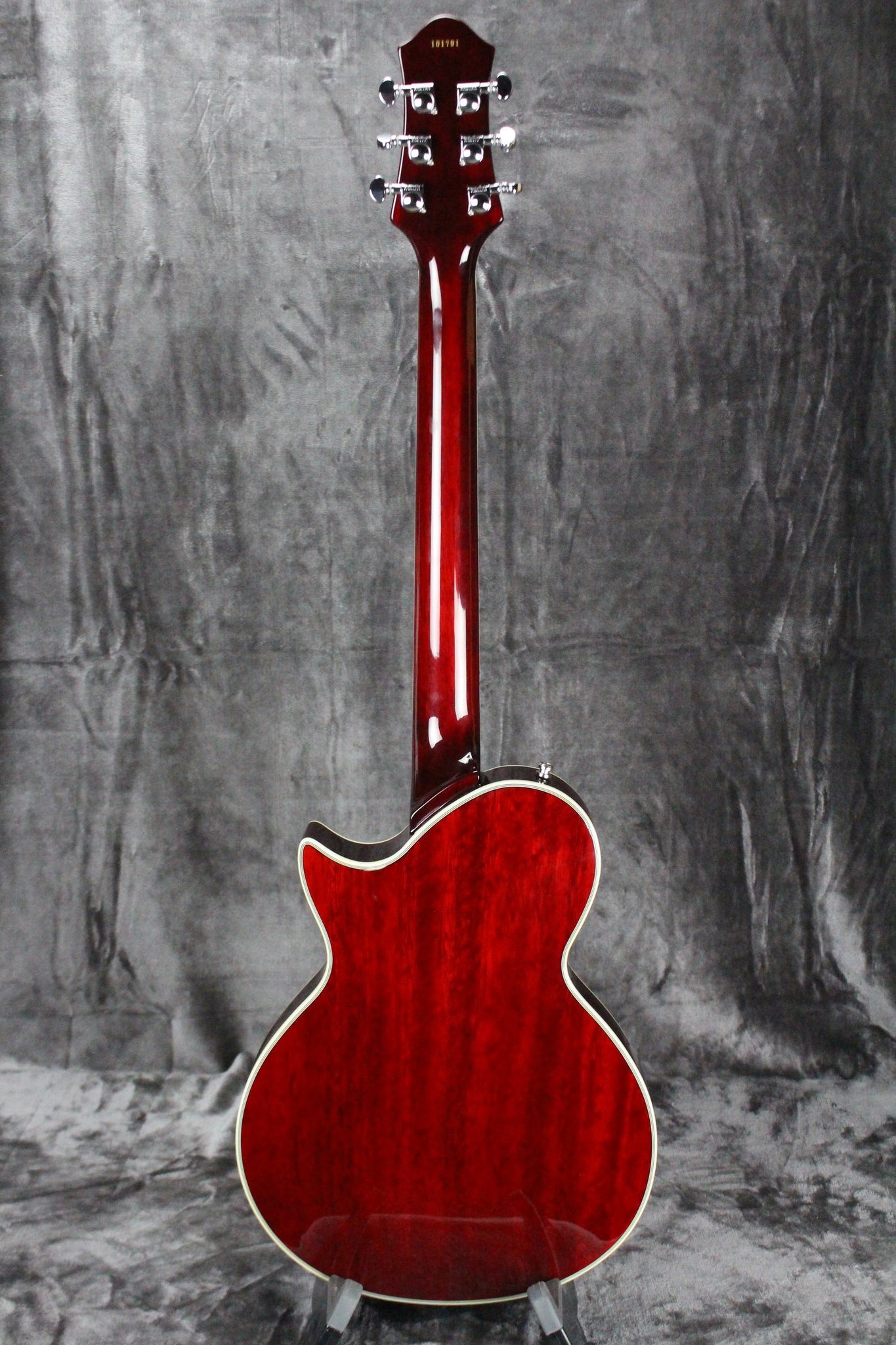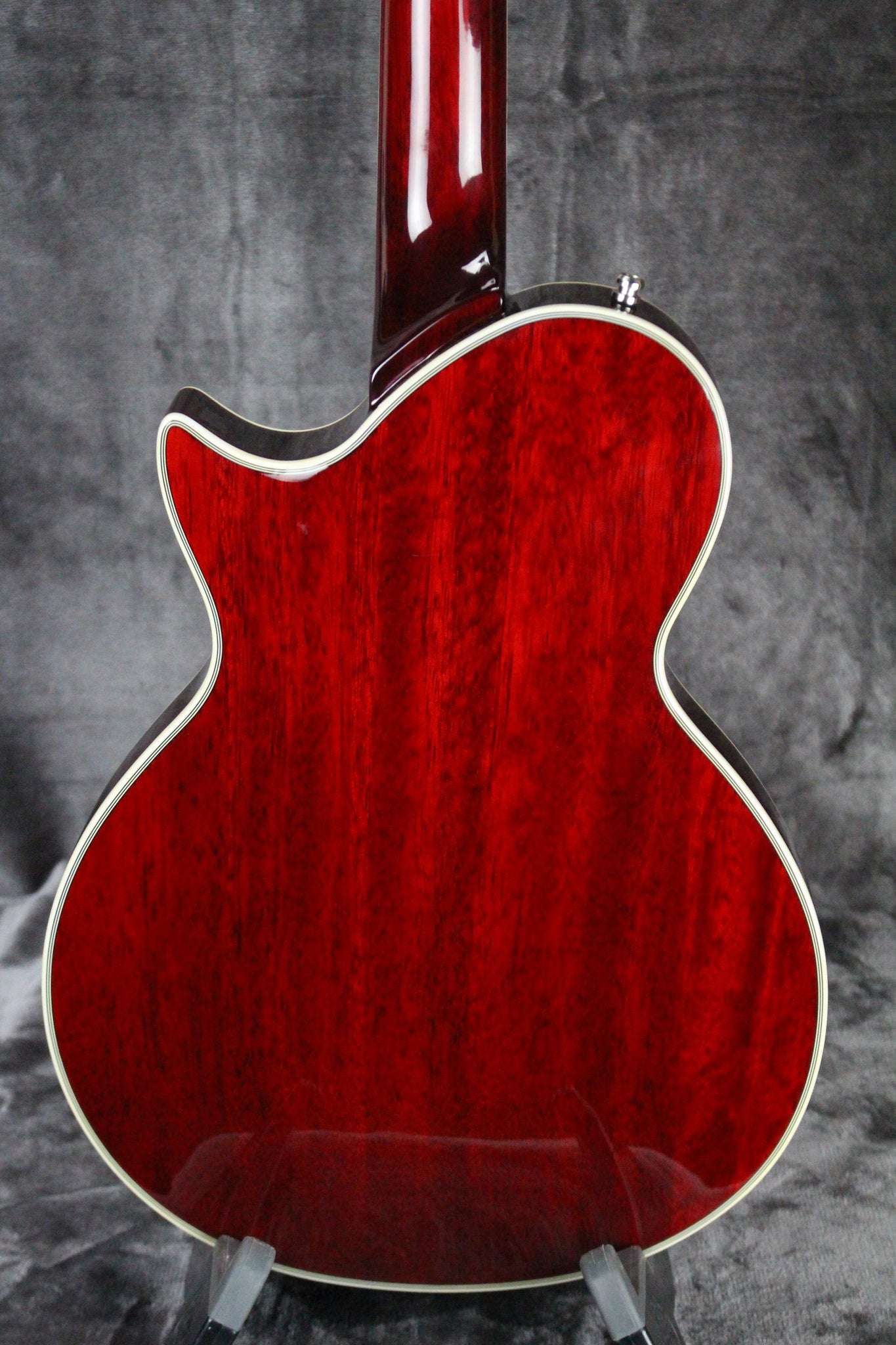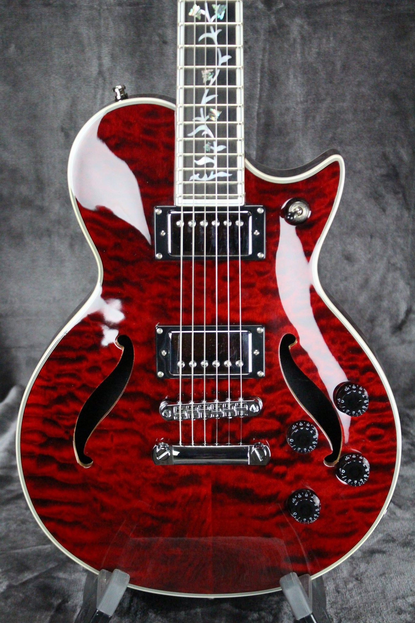 Body: Solid Mahogany with a Solid Carved Maple top, cream binding, finished in a red quilted gloss.