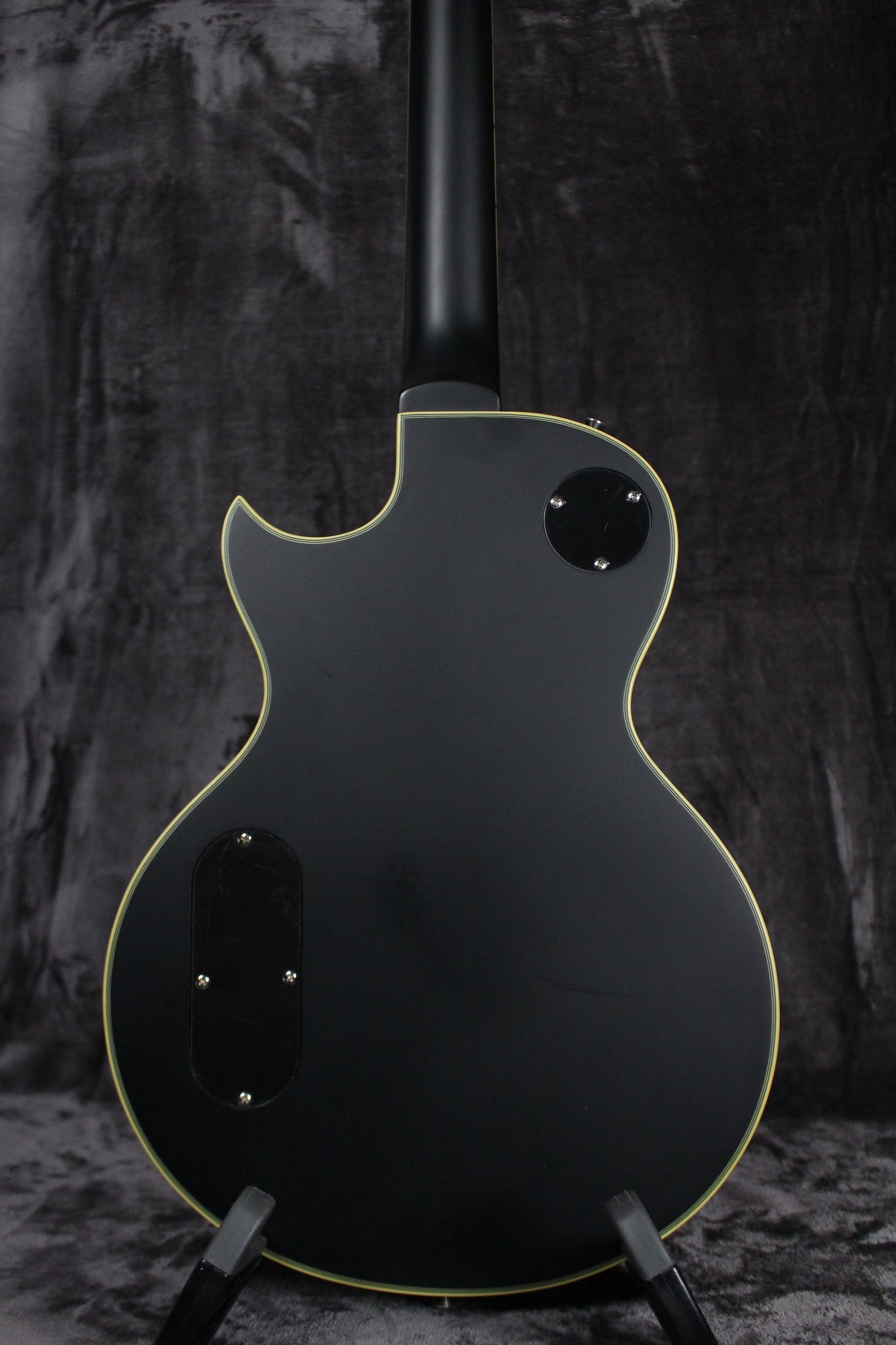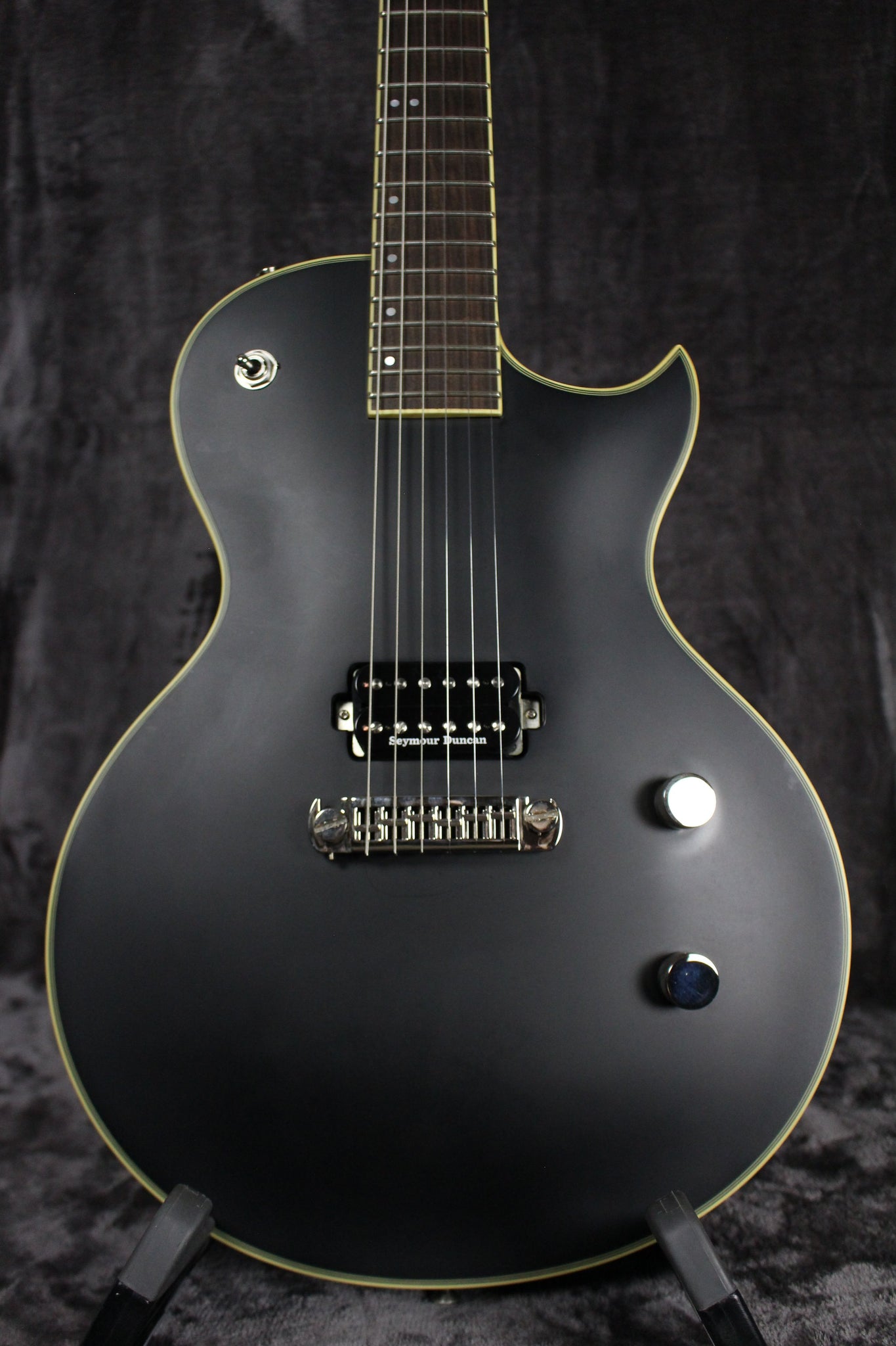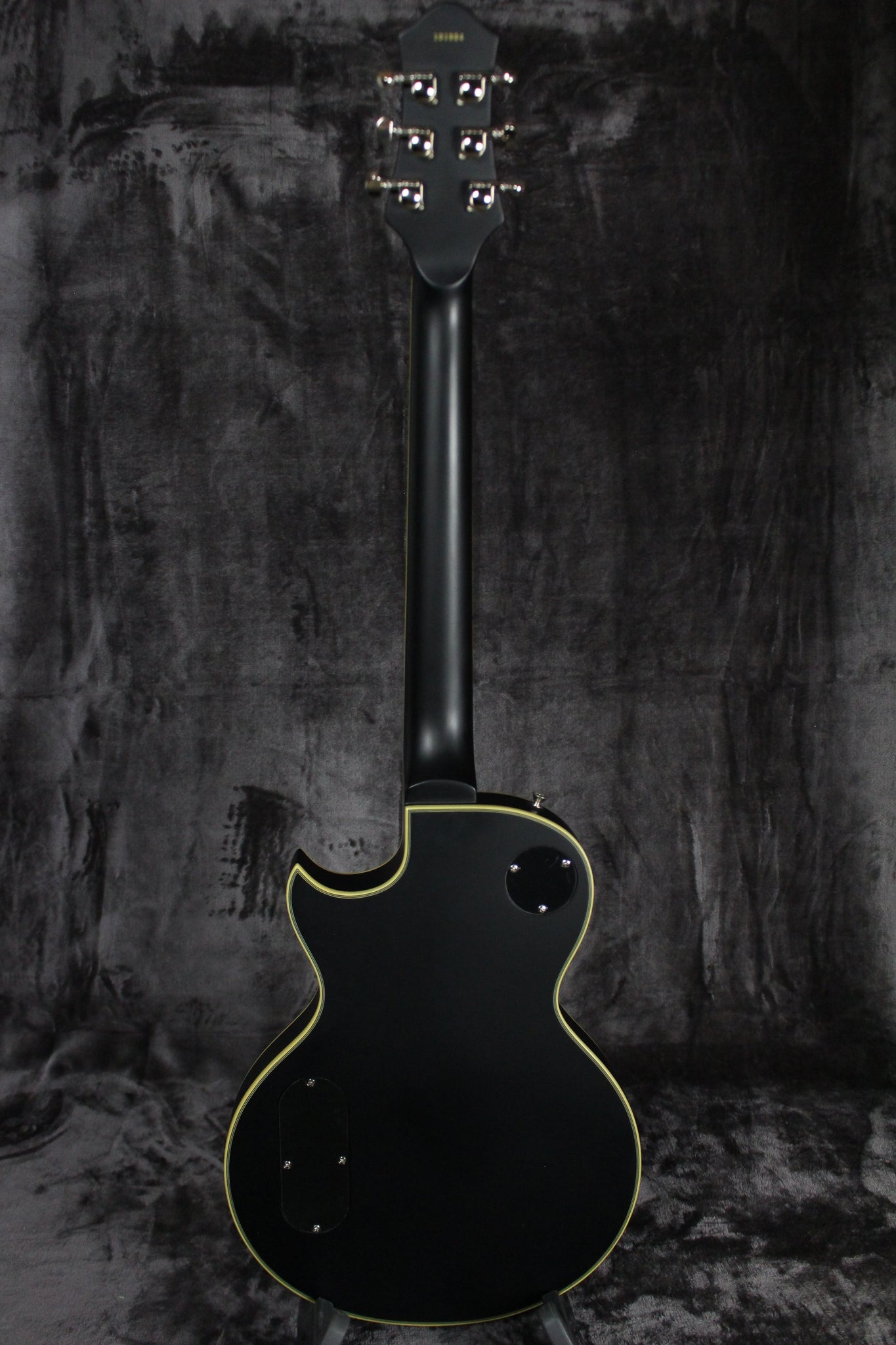 Body: Solid Mahogany with solid carved Maple top in Black satin finish.
