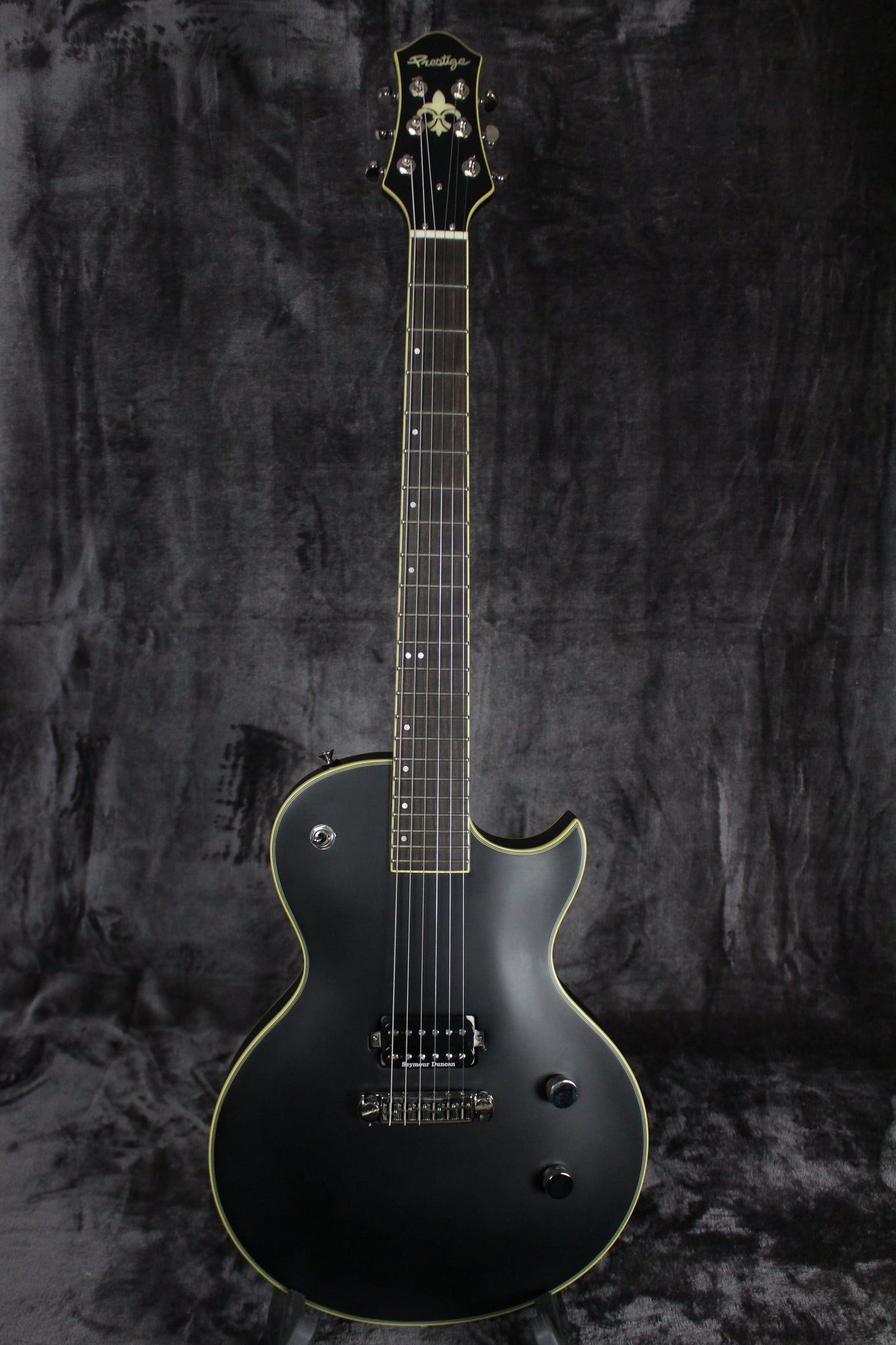 Summary: The Prestige Troubadour is a single cutaway solid body guitar, boasting a killer combo of solid 3/4” carved Canadian Maple top and solid mahogany body and neck. The guitar is finished with a satin/matte black top, with satin/matte stained mahogany sides, back and neck with cream 3 ply binding surrounding the body, and a cream bound neck and headstock. The guitar features an ebony fingerboard with clean, understated, offset mother of pearl dot inlays. The Troubadour will be coil spl, small indentations it and loaded with a Seymour Duncan pickup that is direct mounted. Controls include single nickel knurled volume and tone knobs, and on-off toggle switch. Hardware is rounded out with all-nickel TonePros intonatable wraparound bridge and 18:1 Grover 305 Tuners.