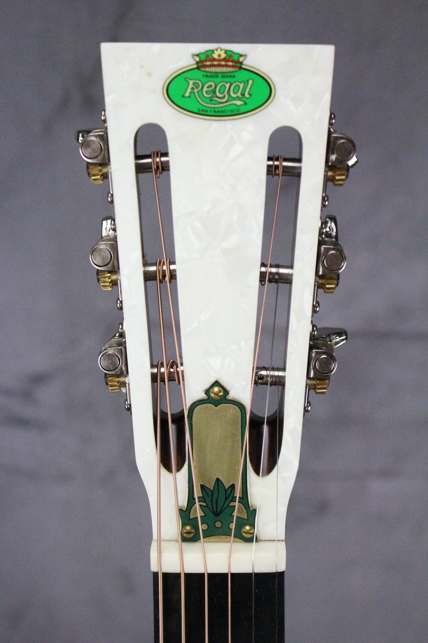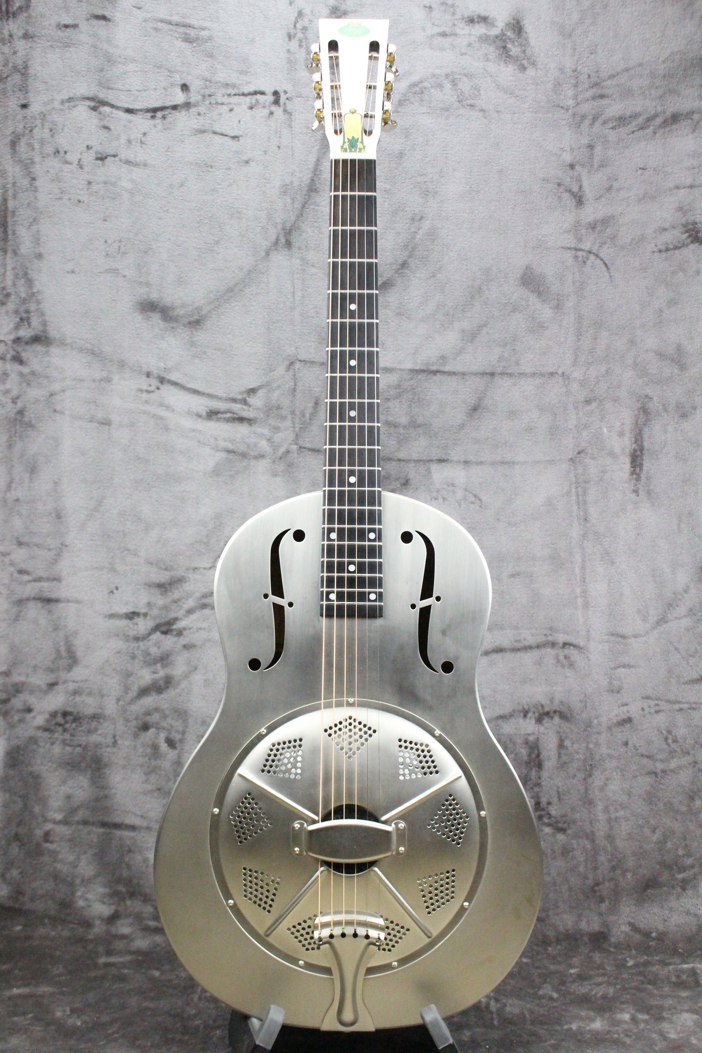 The Regal RC-43 Triolian-style metal-body guitar has the sound, the feel and the look of that 80-year-old collectible you've been thinking of. With its steel body nickel-plated in an antique finish, you can hardly believe this is a new guitar. The spun aluminum resonator cone with wooden biscuit bridge provides the correct, historical sound along with immense volume and carrying power. The mahogany neck is slimmed down for modern tastes, while the slotted peghead with pearloid overlay is totally original. An adjustable truss rod is another modern improvement that makes the RC-43 the best of both worlds, the old and the new.