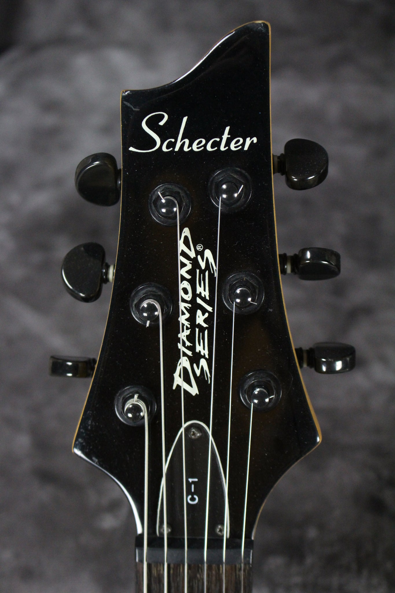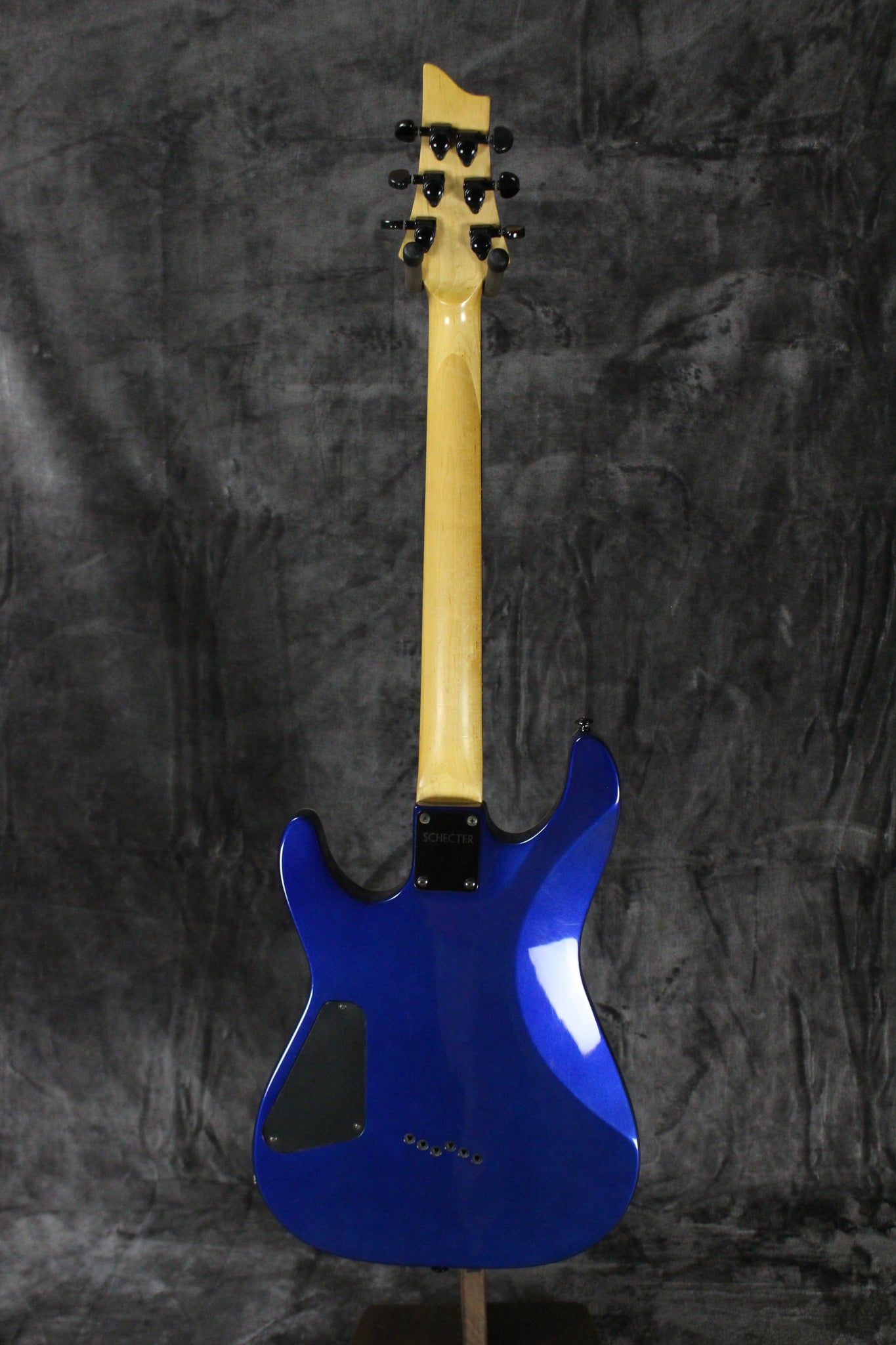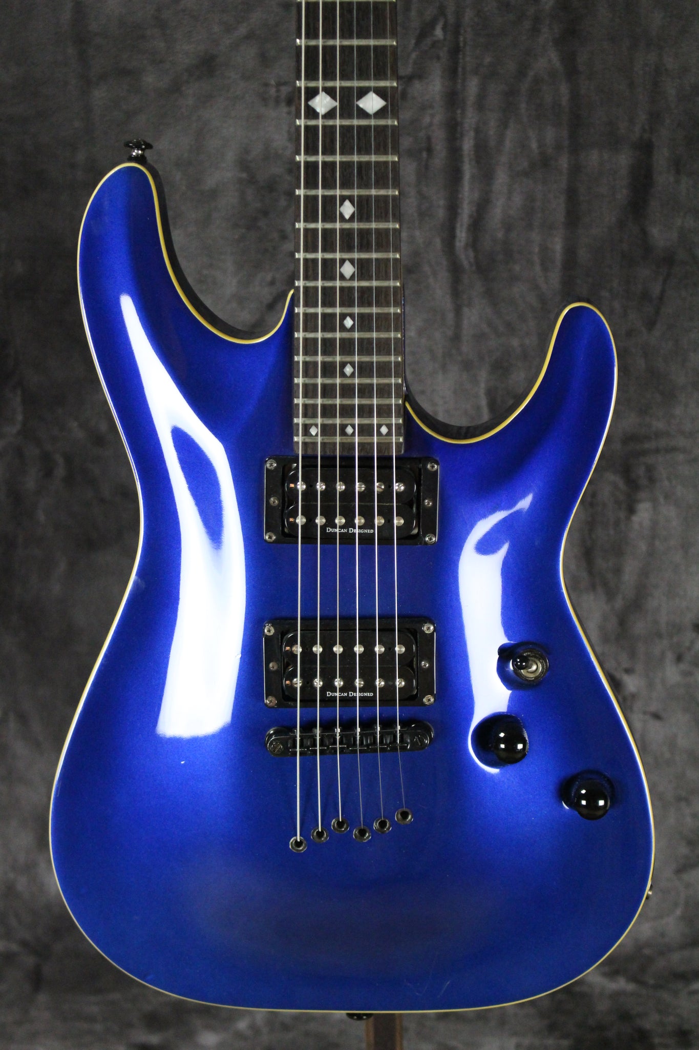This Schecter C-1 has a silky neck with easy access to the upper frets. This stunning sapphire maple on mahogany beauty is appointed with black hardware, Grover tuning machines, a Maple set neck with fast Rosewood fretboard and 24 jumbo frets, diamond inlays, and a Tune-O-Matic bridge. Two Duncan Designed humbuckers ensure plenty of tonal punch.