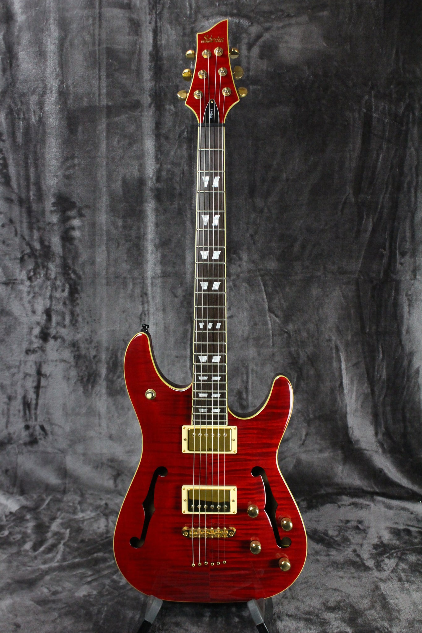 Summary: This 2002 Schecter C/SH-1 features a string thru the body & set neck construction that makes it an absolute joy to play. The Mahogany body, embellished with twin F holes is resonant, singing further with the Maple top.