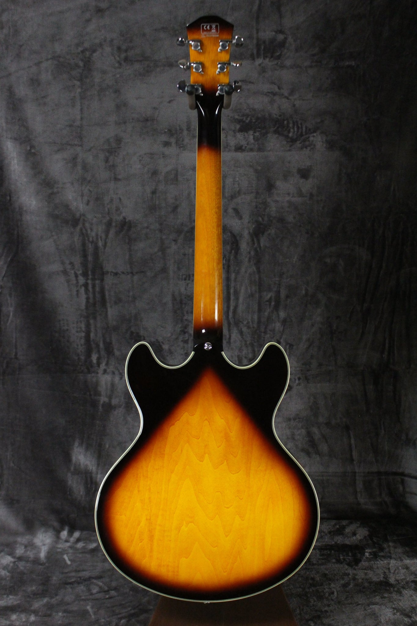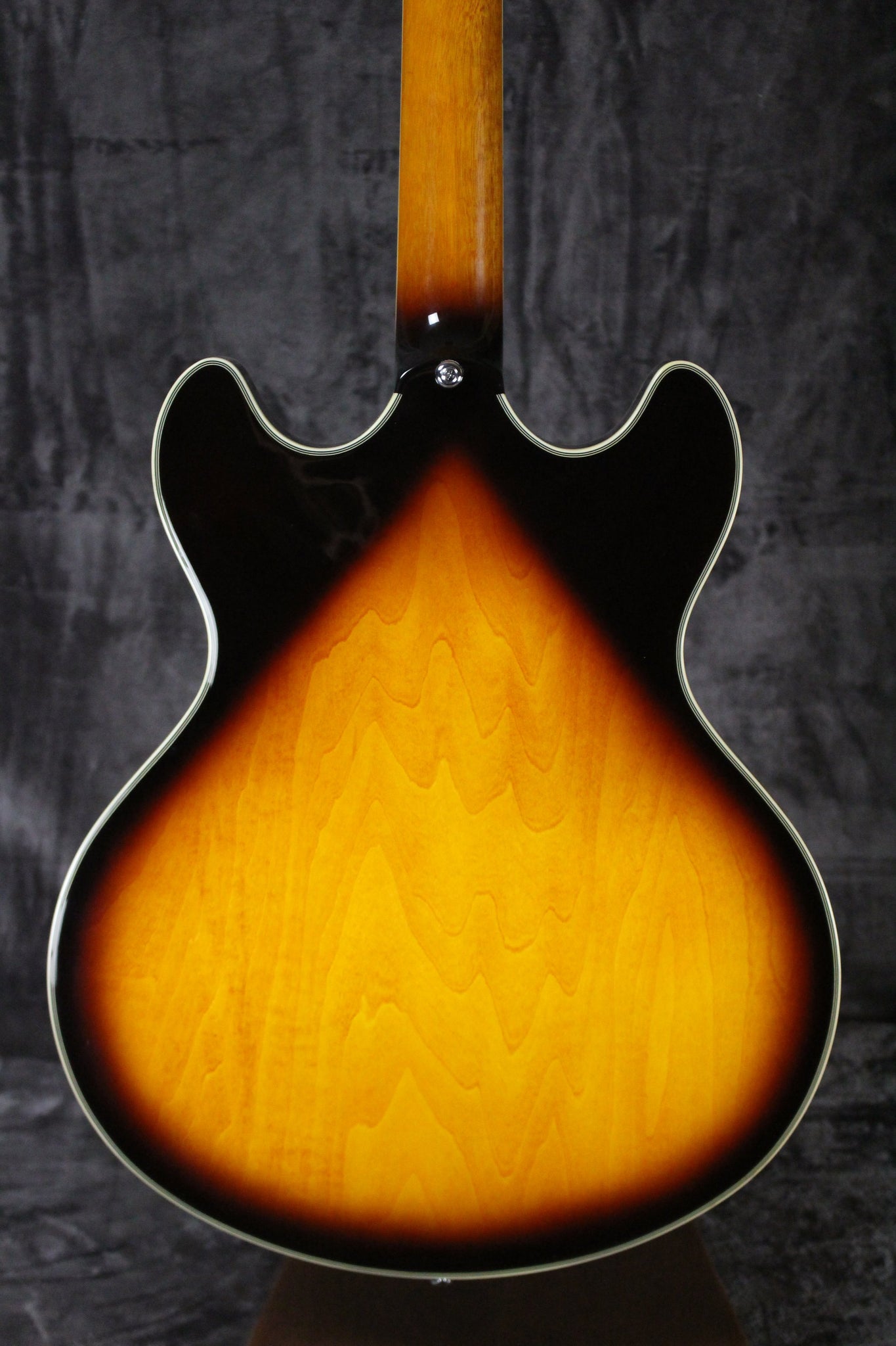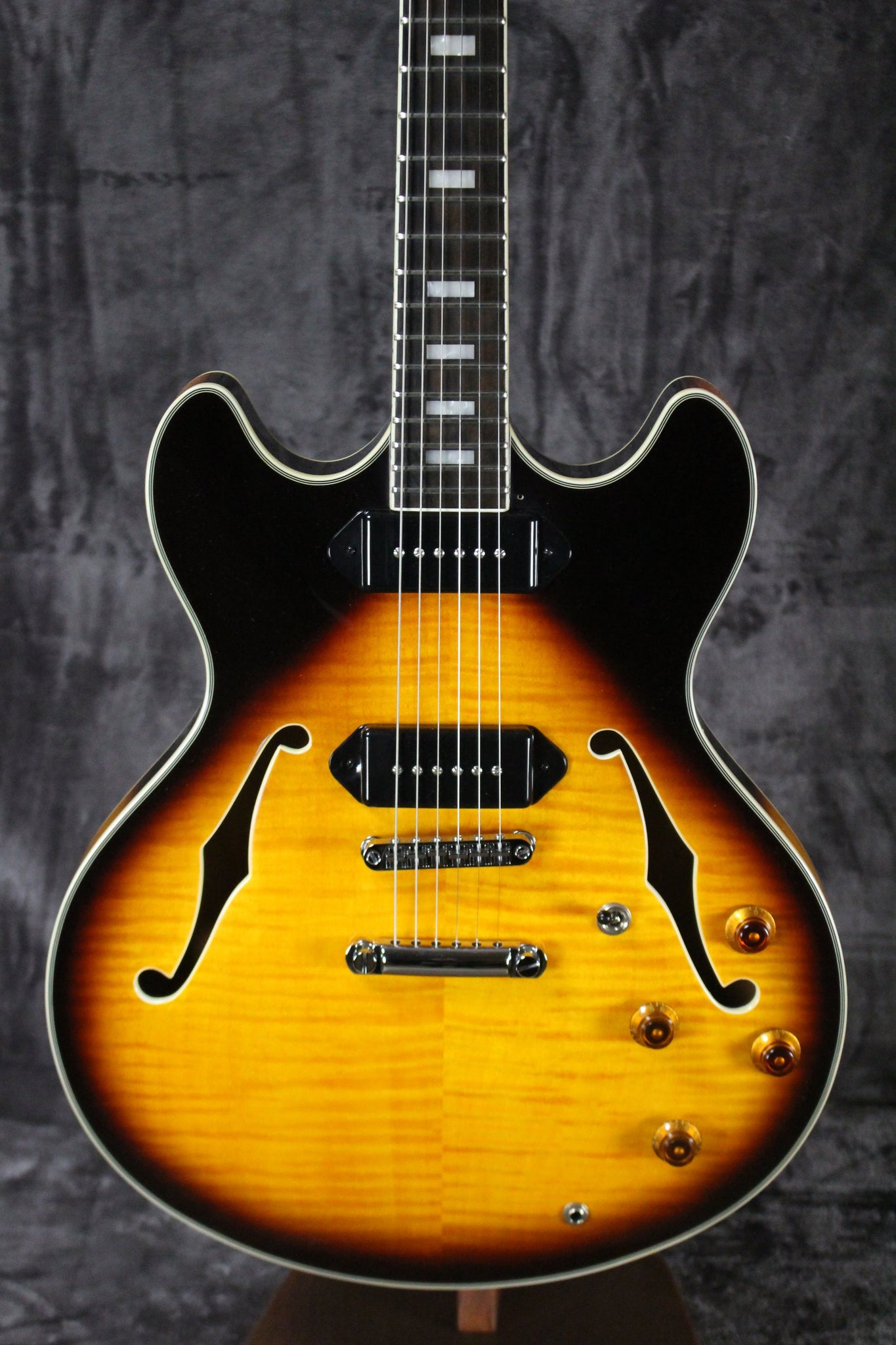 Body: Semi-hollow body with flame Maple, top, back, and sides. Maple center block. Cherry sunburst.