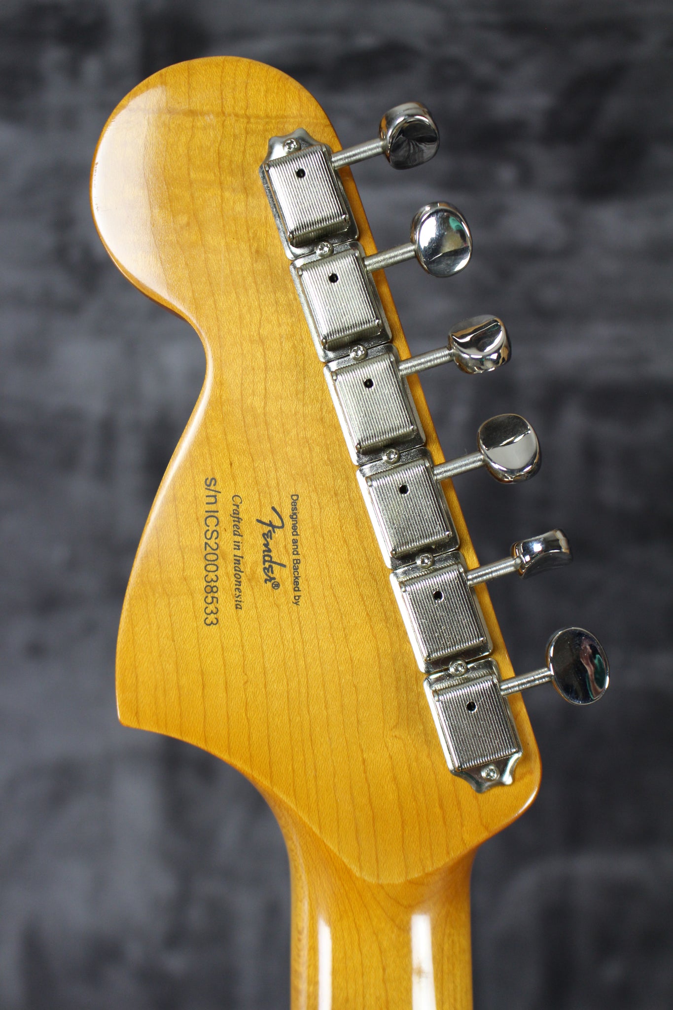Pickups/Hardware:  Fender Designed Alnico Single-Coil  pickups, Vintage-Style tuning keys, 6-Saddle Vintage-Style Synchronized Tremolo bridge, aged white plastic knobs, bone nut.