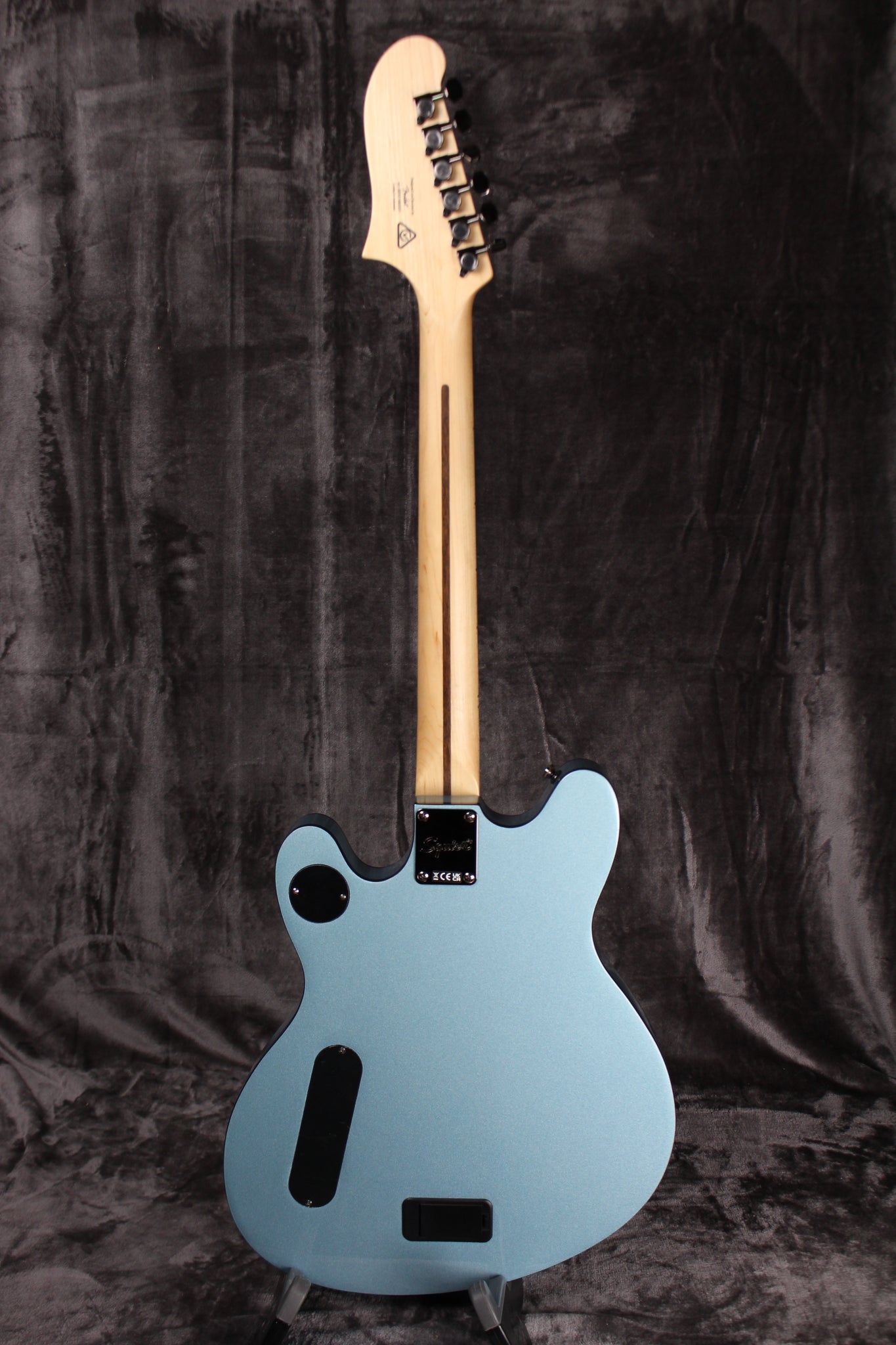 Pickups/Hardware: Squier SQR Active Ceramic Humbucker pickups, active electronics, die-cast sealed tuning keys, 6-Saddle adjustable bridge bridge, skirted amp knobs, synthetic bone nut.