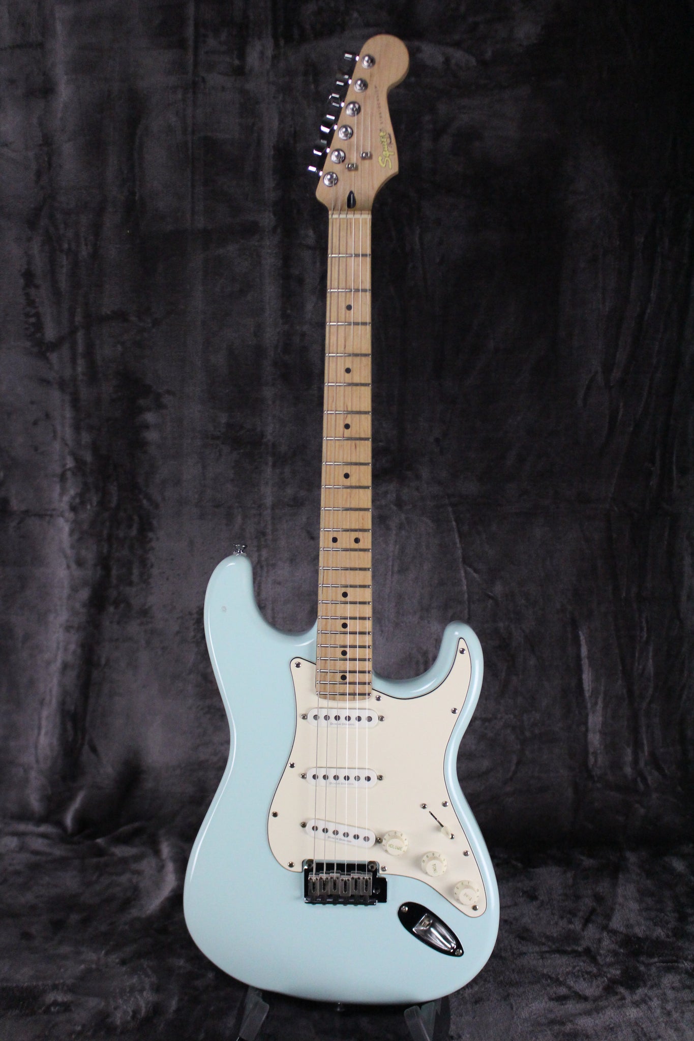 Summary: This Squier Deluxe Stratocaster is a true class act, with the satin-finished maple neck, fast and comfortable, while the Deluxe Stratocaster's basswood body houses three great-sounding Seymour Duncan-designed single-coil pickups. A twin-pivot tremolo bridge, chrome hardware, a parchment pickguard, and a 5-way pickup selector round out this fine instrument.