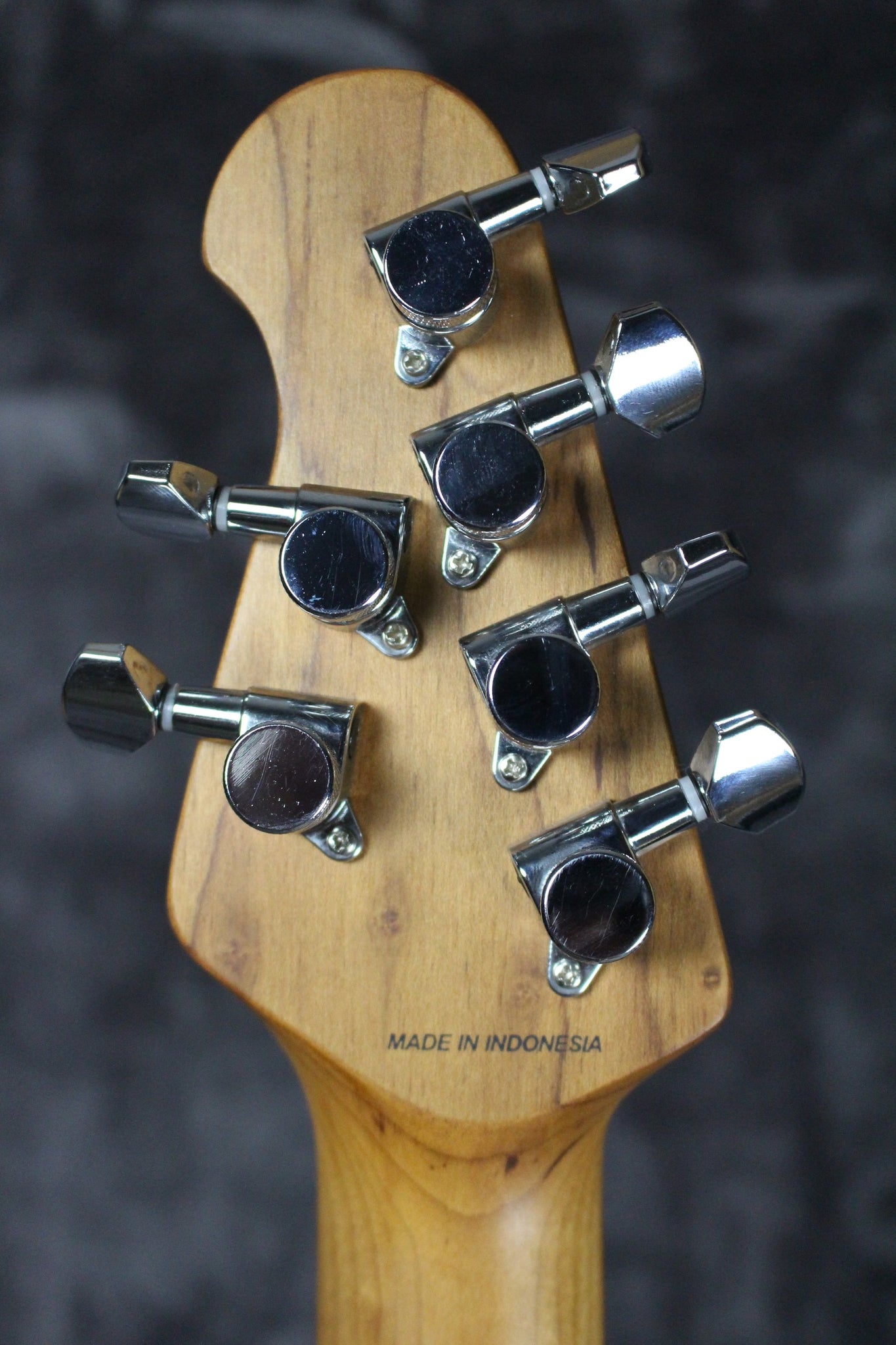Pickups/Hardware: Two Single coil pickups and a humbucker in the bridge position, locking tuning keys, white pickguard, chrome hardware, tremolo system.