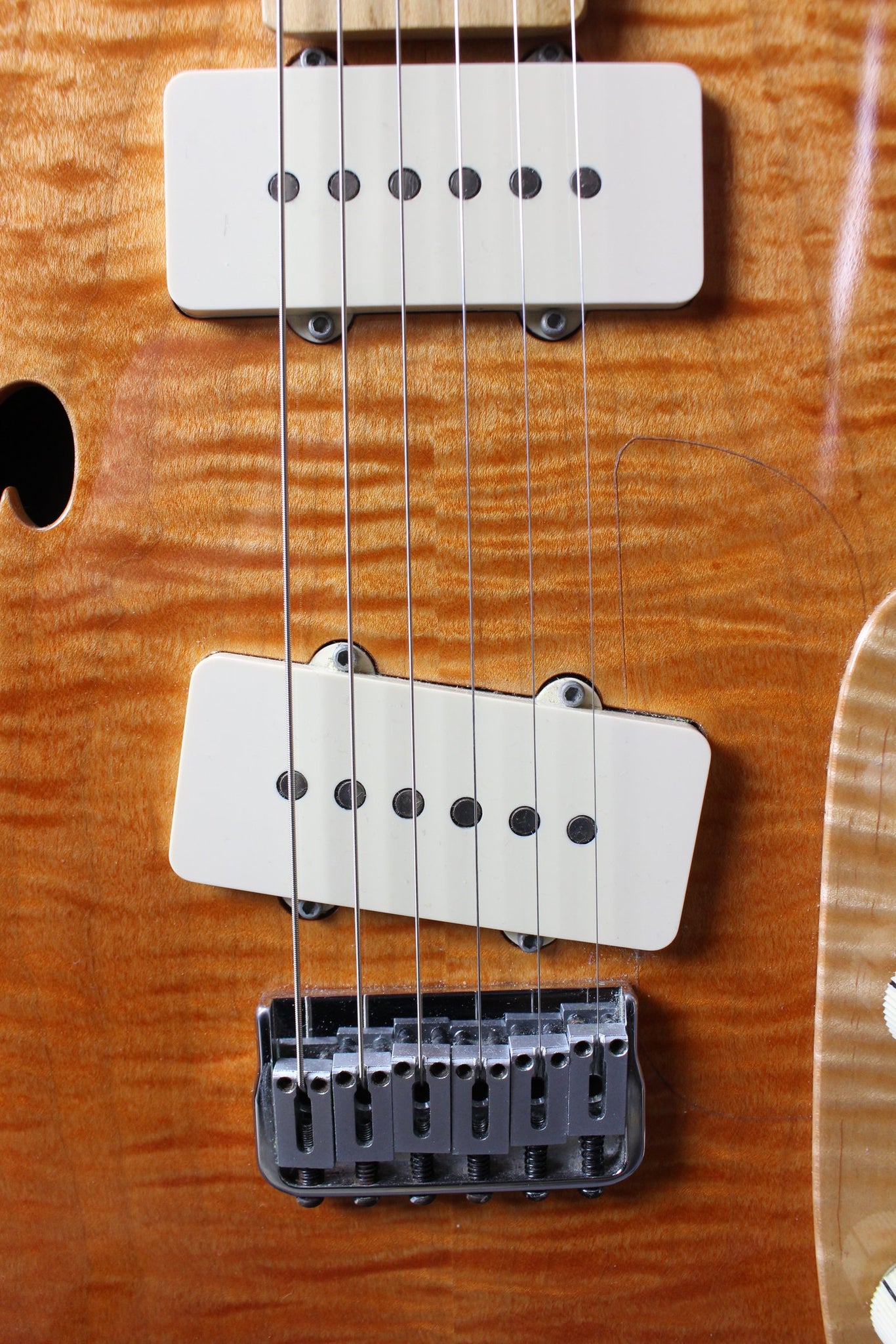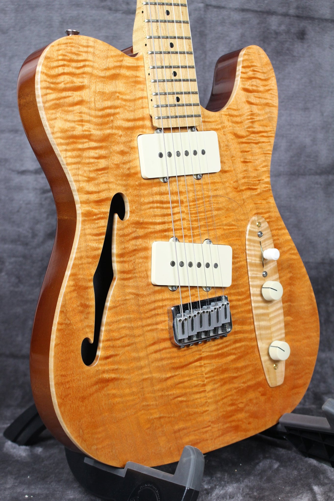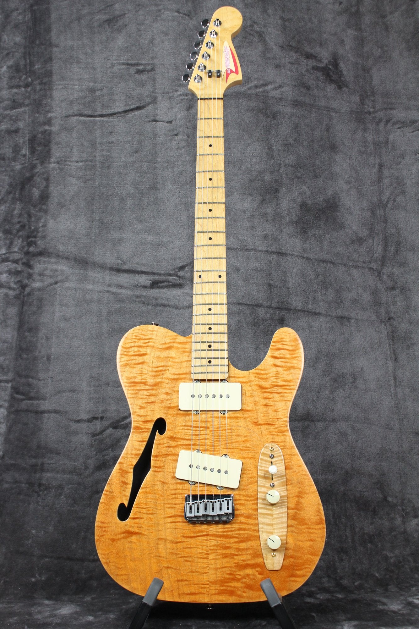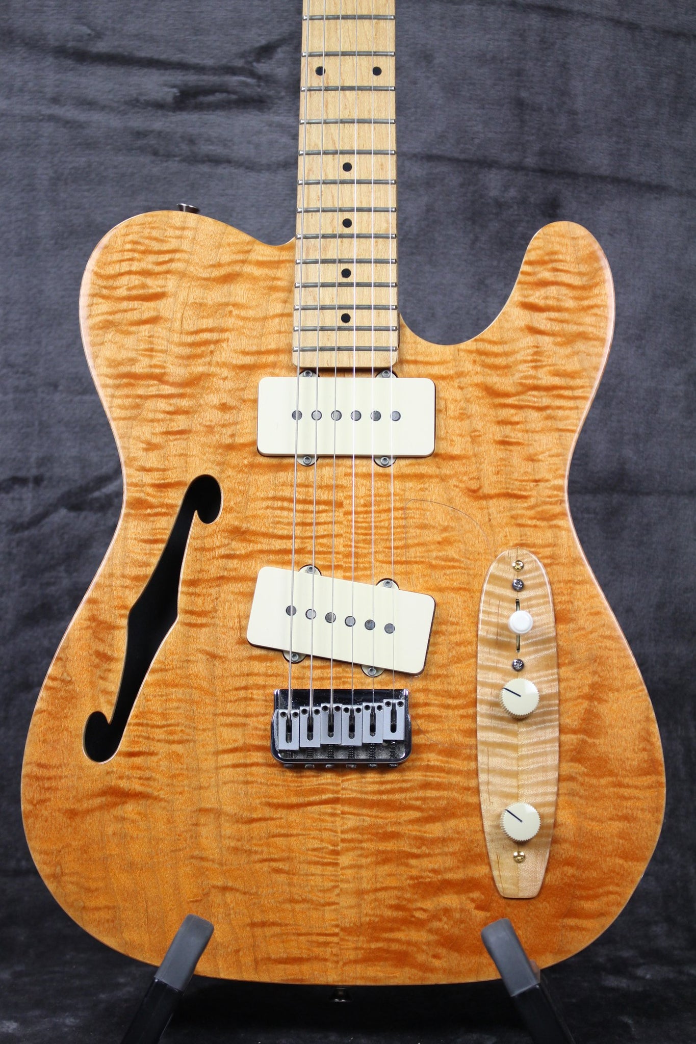 Body: Two-piece flamed maple top with a three-piece mahogany back, thinline style, telecaster shape with an f-hole.