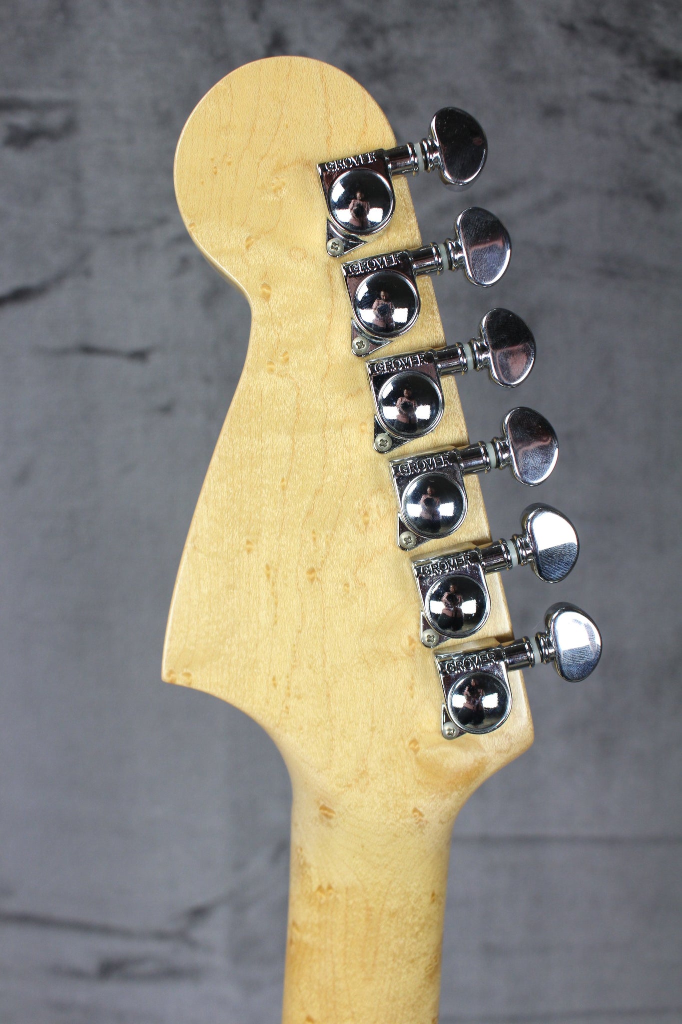 Neck: Birdseye maple, Stratocaster shaped headstock, black dot inlays, bolt-on.