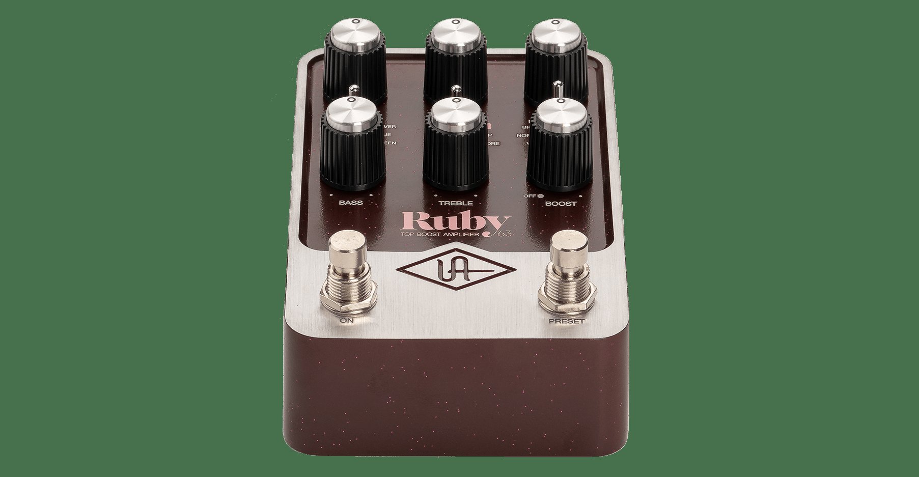 The UAFX Ruby '63 Top Boost Amplifier pedal gives you the quintessential British valve amp beloved by artists and producers for over 60 years, from Queen to U2 to Radiohead. Built on powerful dual-engine processing and UAD modeling expertise, the Ruby '63 effects pedal delivers choirboy cleans, complex overdrive, and classic vibrato.