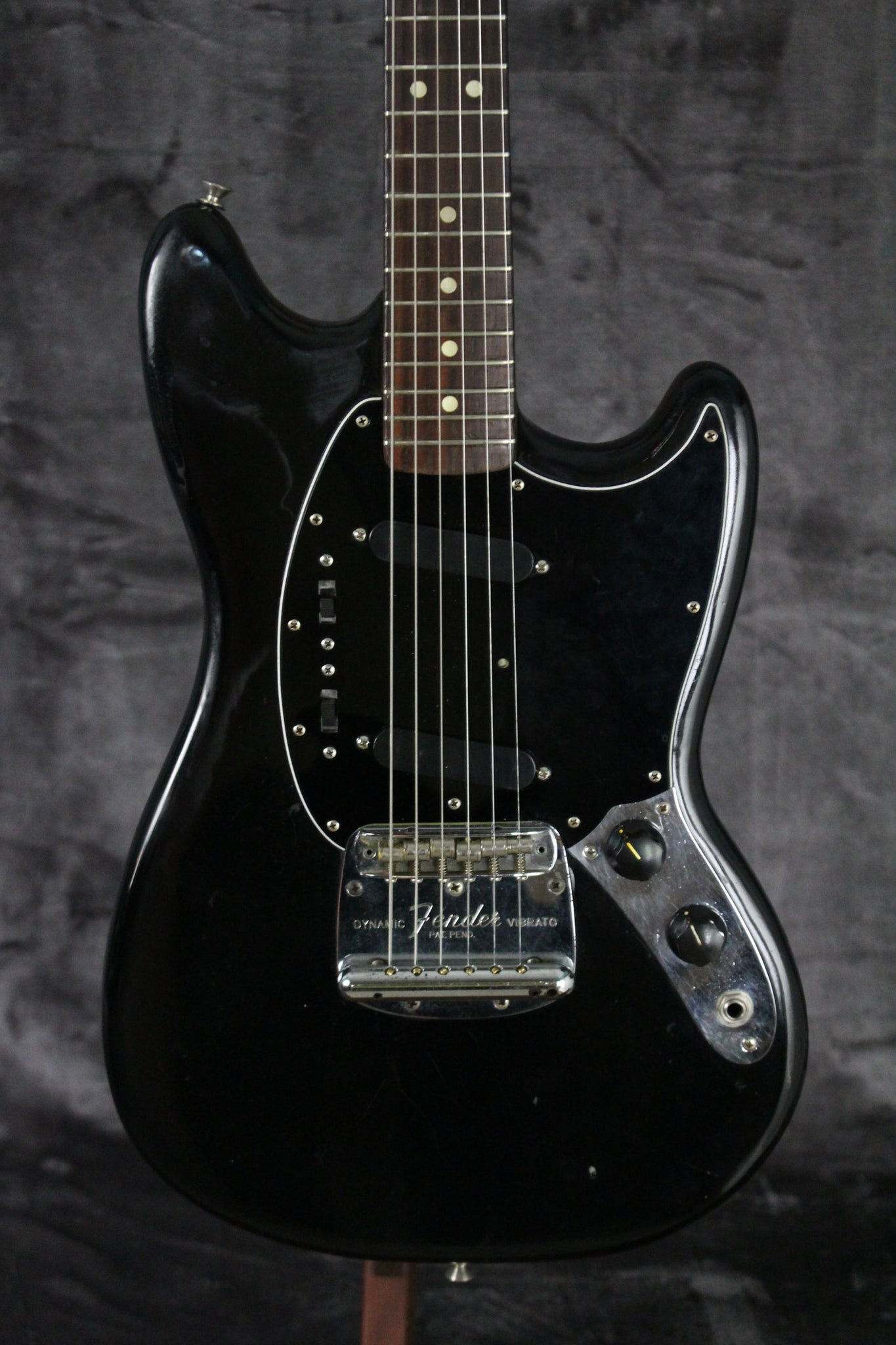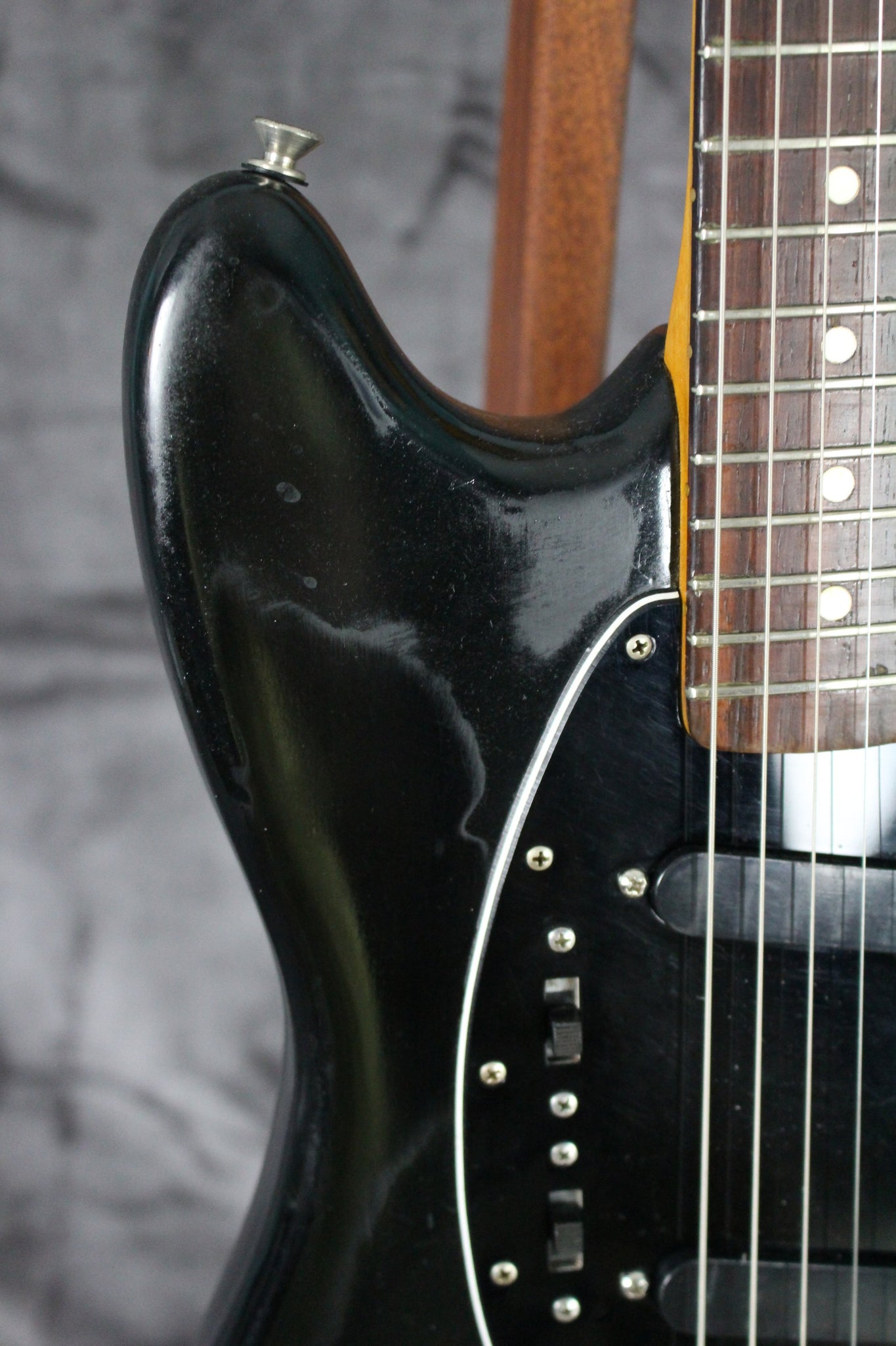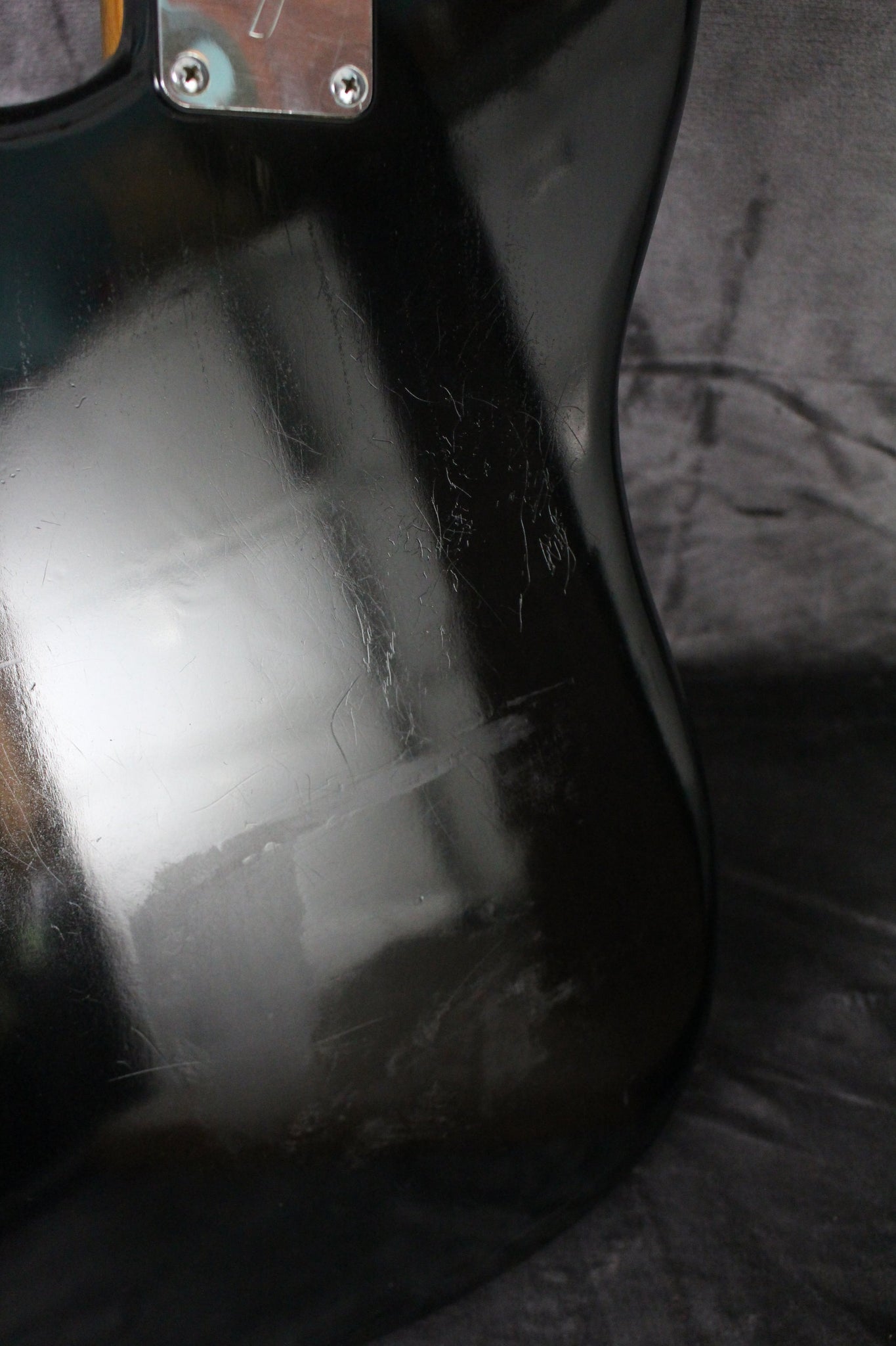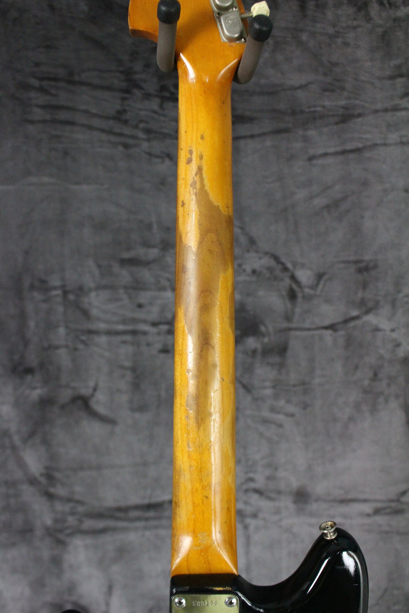 Cosmetics: This is a good “player” guitar that has an old black refinish. It has one siginificant ding to the wood near the jack on the lower side.The frets are worn but still have life. The back has some old sticker residue. The neck maintains its original finish with significant play wear on the neck. Its original “Fender” logo looks great and is completely intact. Overall, this guitar plays well and sounds fantastic.