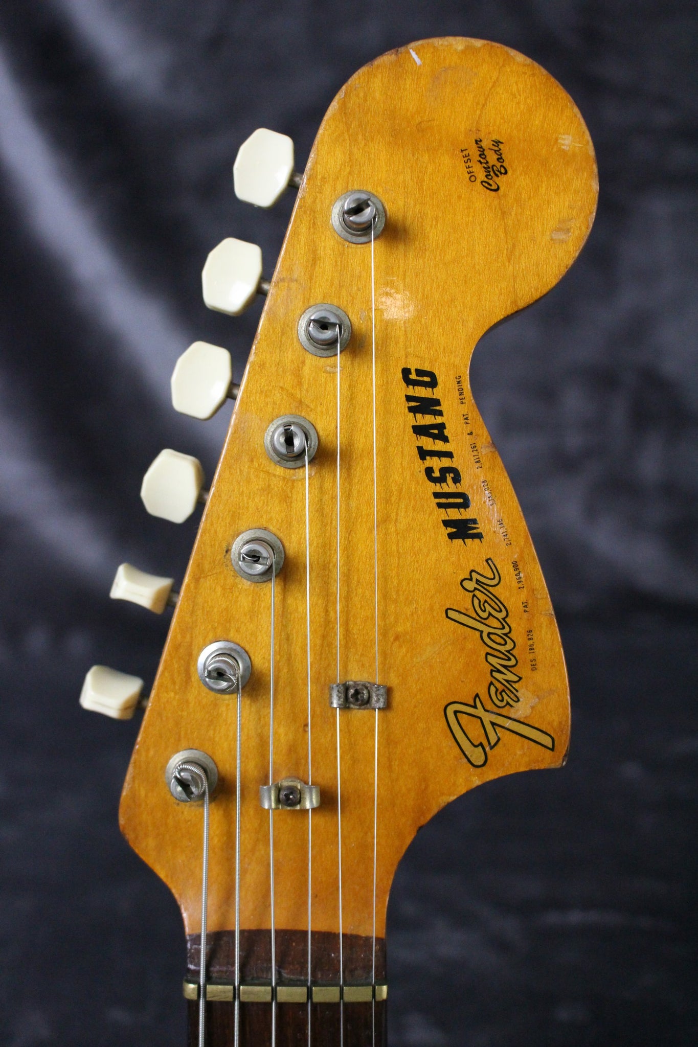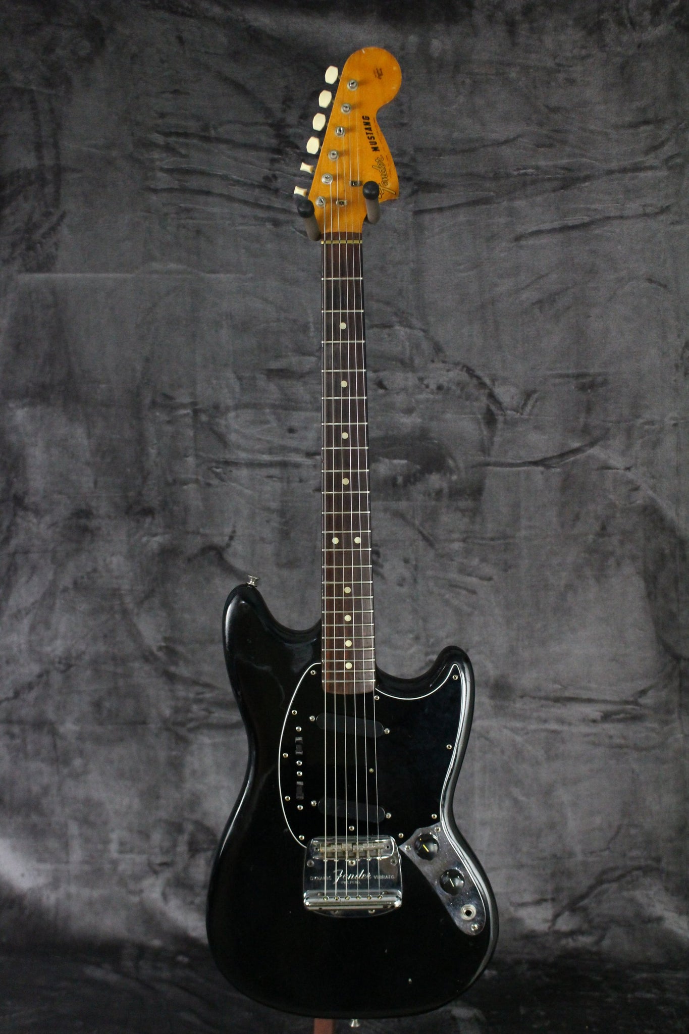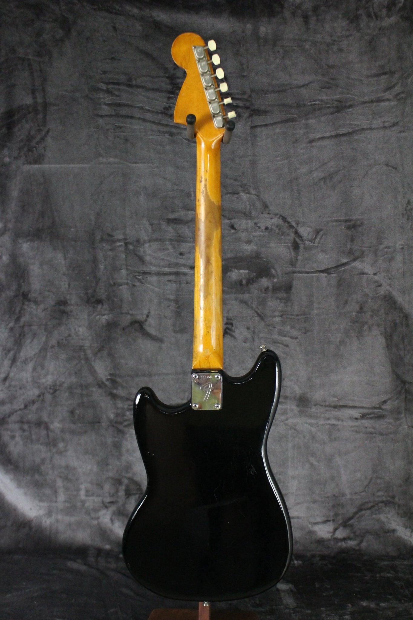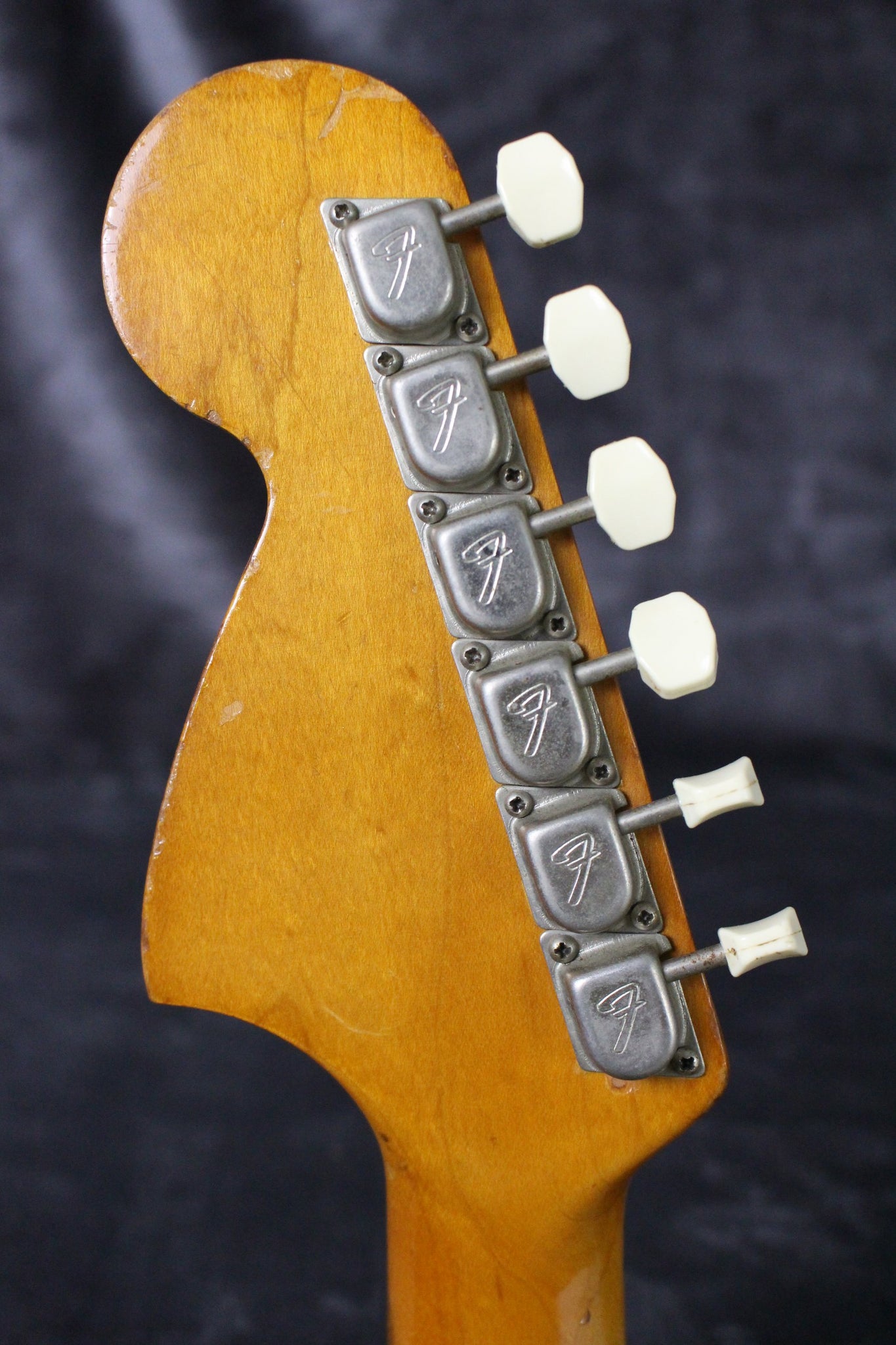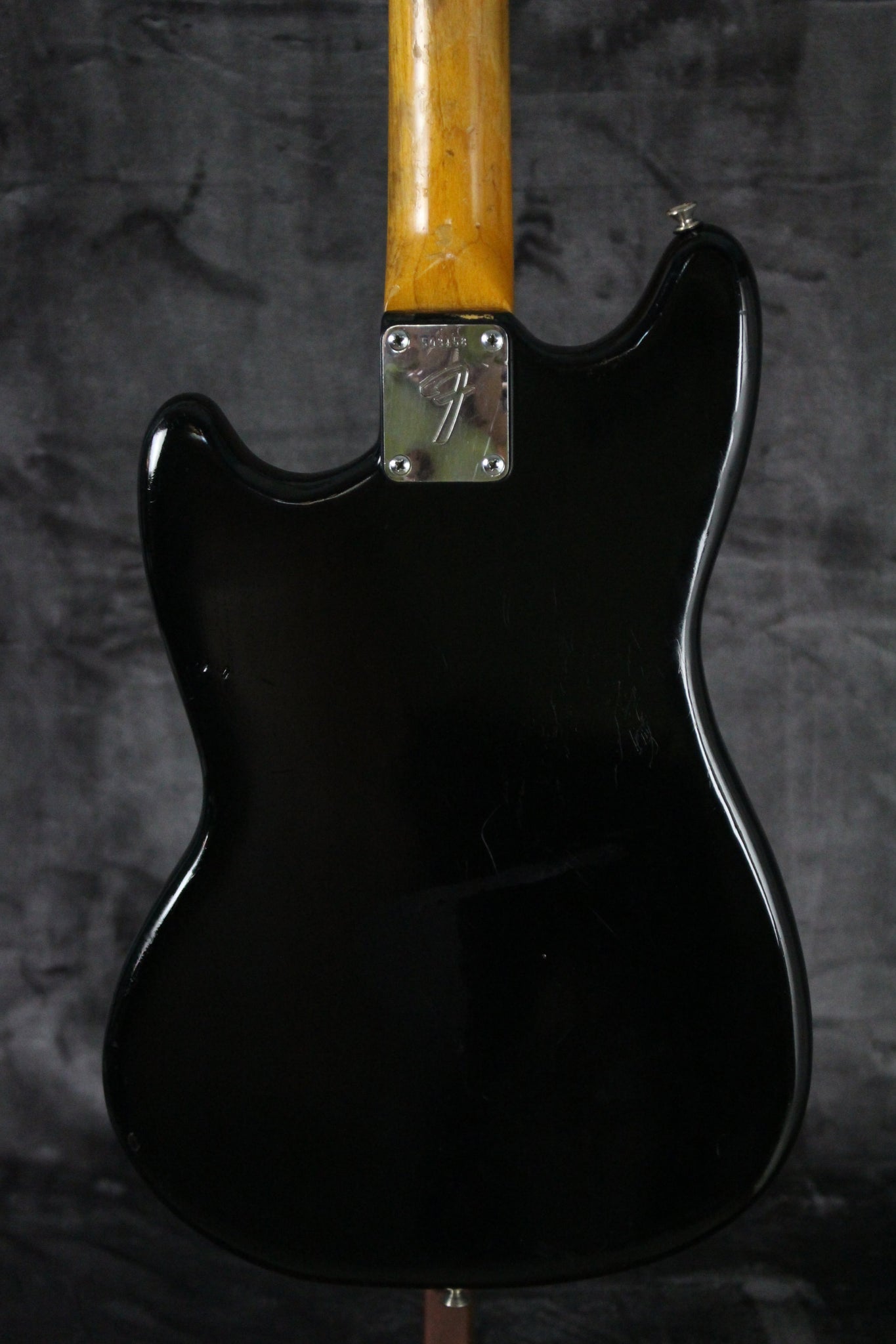 Cosmetics: This is a good “player” guitar that has an old black refinish. It has one siginificant ding to the wood near the jack on the lower side.The frets are worn but still have life. The back has some old sticker residue. The neck maintains its original finish with significant play wear on the neck. Its original “Fender” logo looks great and is completely intact. Overall, this guitar plays well and sounds fantastic.