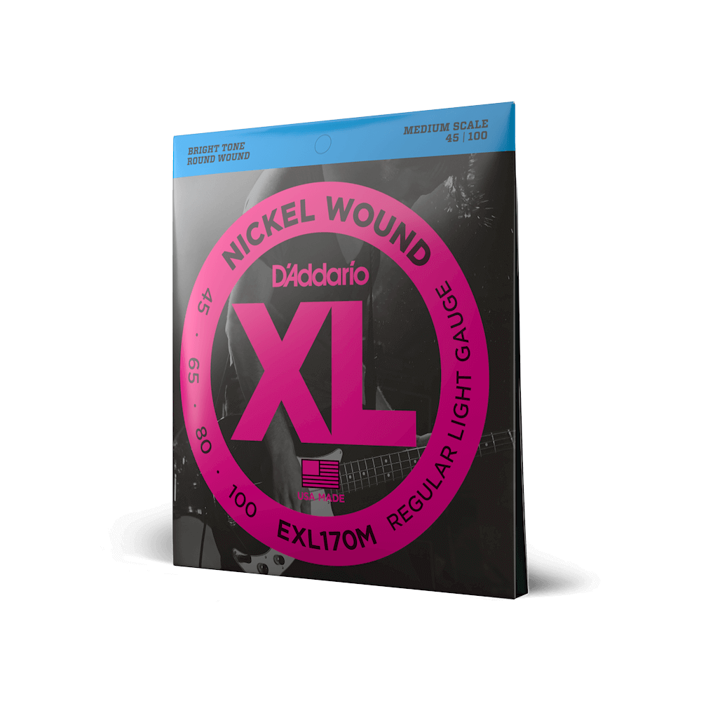 XL Nickel are the industry standard in electric bass strings. With their clear fundamentals, booming tight lows, and reliable D’Addario construction, they’re trusted by players everywhere to handle any performance. XL Nickel bass strings are made with a high carbon steel core and wound with nickel-plated steel wrap wire, for consistently bright tone and smooth playability, great for a wide variety of bass styles. This 45-100 Regular Light set is the medium scale version of our most popular bass gauge, providing a perfect blend of response and playability.